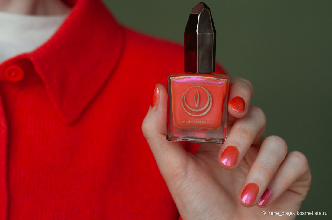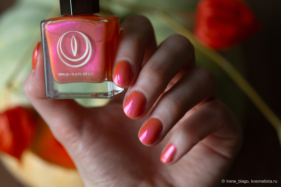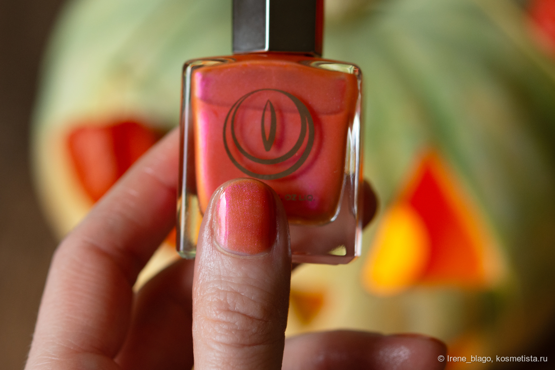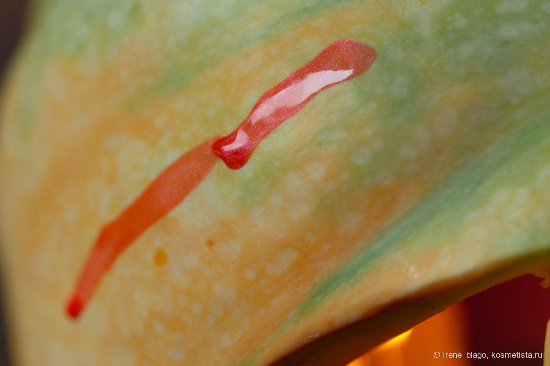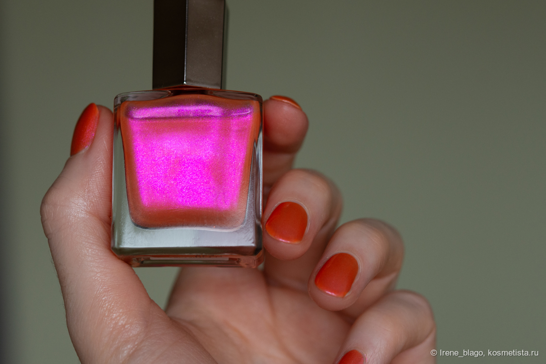 Представляет собой теплый огненно-тыквенный оттенок с розовым шиммером, который дает красивый кораллово-закатный эффект. При этом какой-то сложности, дополнительных переливов и световой игры в этом сочетании уже нет, хотя очень ожидала увидеть более выраженные цветовые переходы. Поэтому оттенок смотрится максимально ровно в различных погодных и световых условиях.