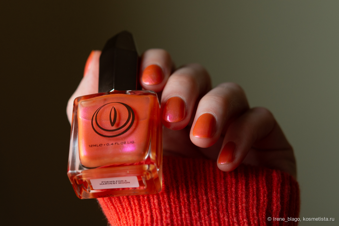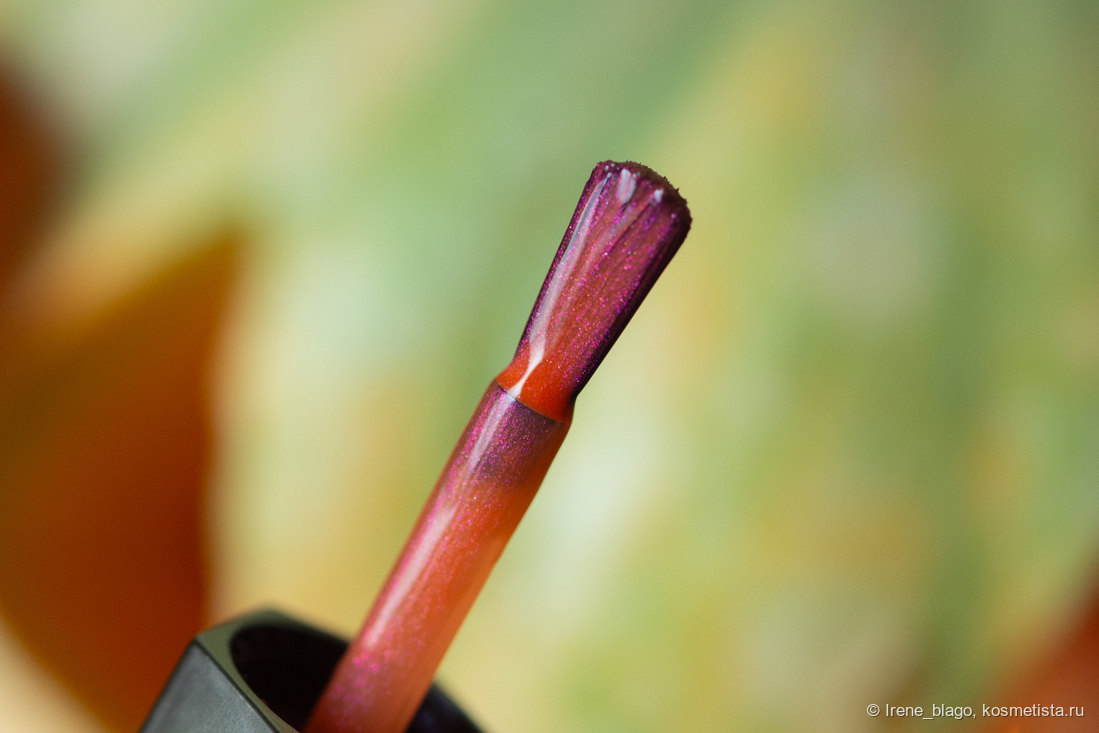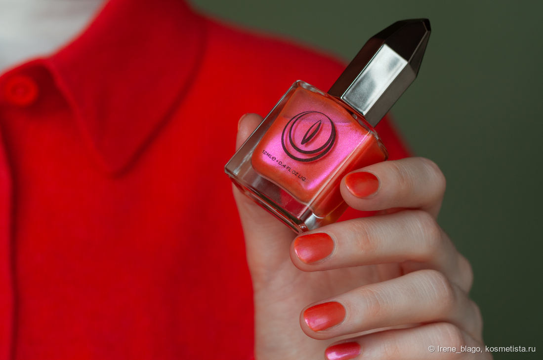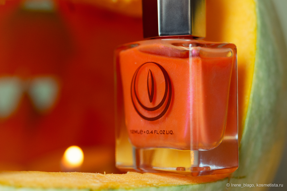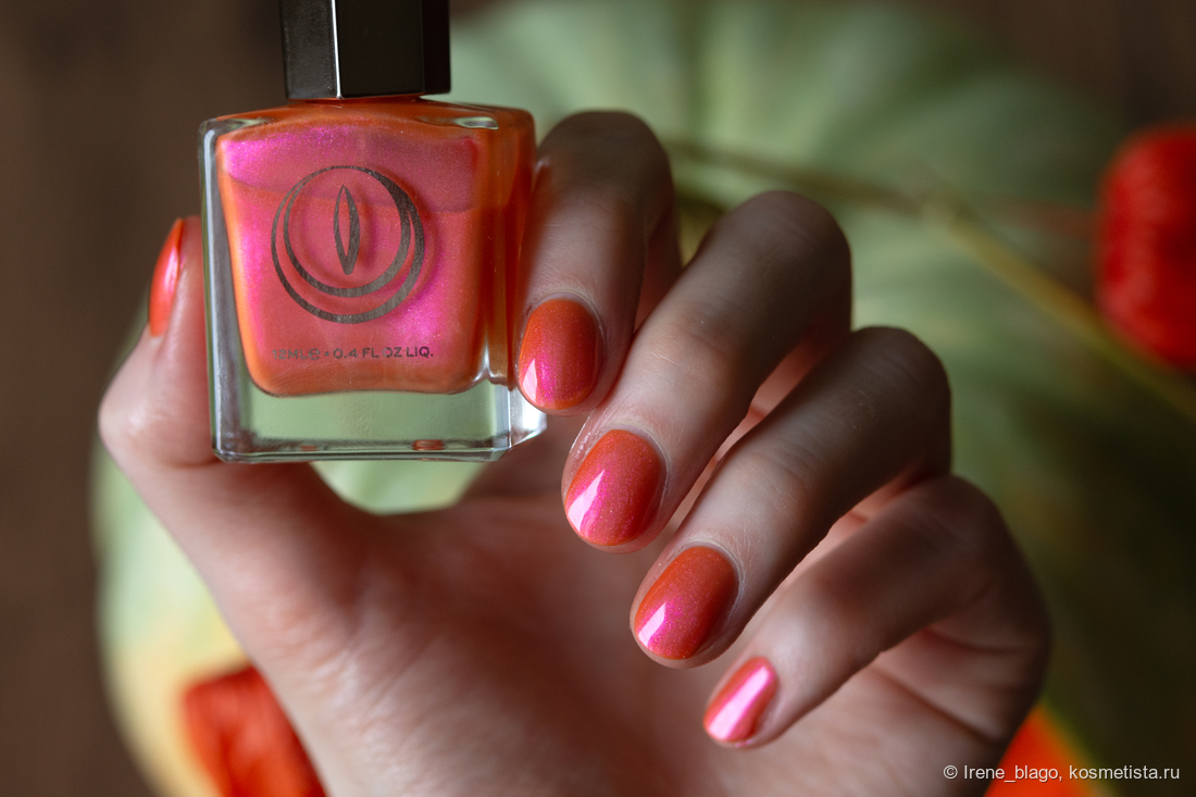 Представляет собой теплый огненно-тыквенный оттенок с розовым шиммером, который дает красивый кораллово-закатный эффект. При этом какой-то сложности, дополнительных переливов и световой игры в этом сочетании уже нет, хотя очень ожидала увидеть более выраженные цветовые переходы. Поэтому оттенок смотрится максимально ровно в различных погодных и световых условиях.