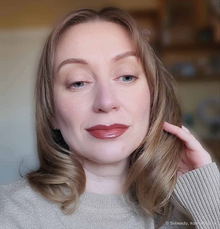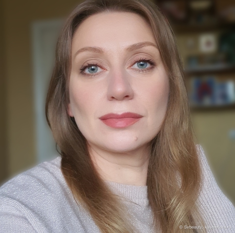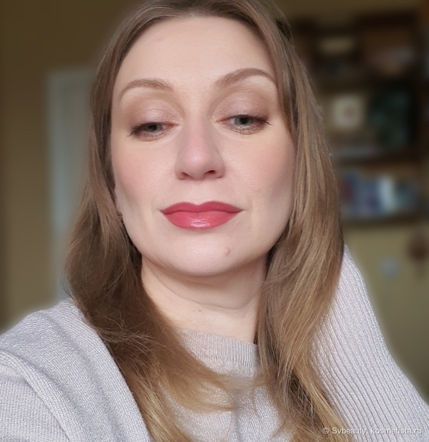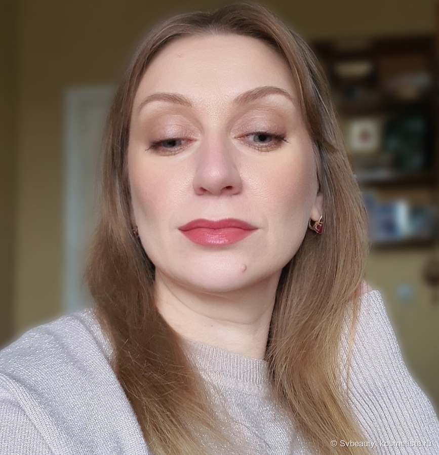 Конечно, при тонком нанесении нет такого сияния, как при нанесении из стика. Зато получается красивый, живой, близкий к матовому финиш, который мне определенно нравится.