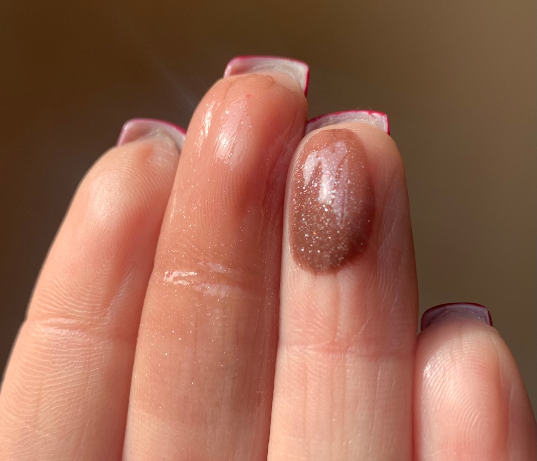 На всех дальнейших фото: на среднем пальце нанесен тонко, на безымянном — в 2 слоя!