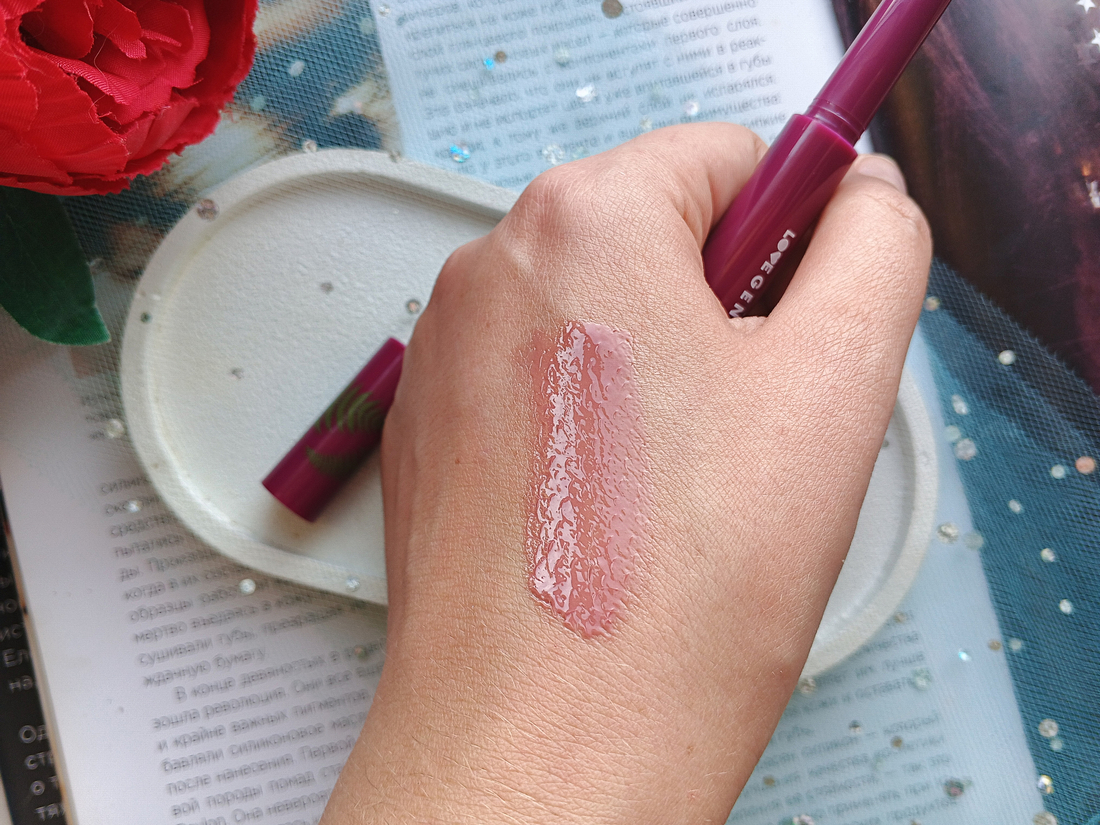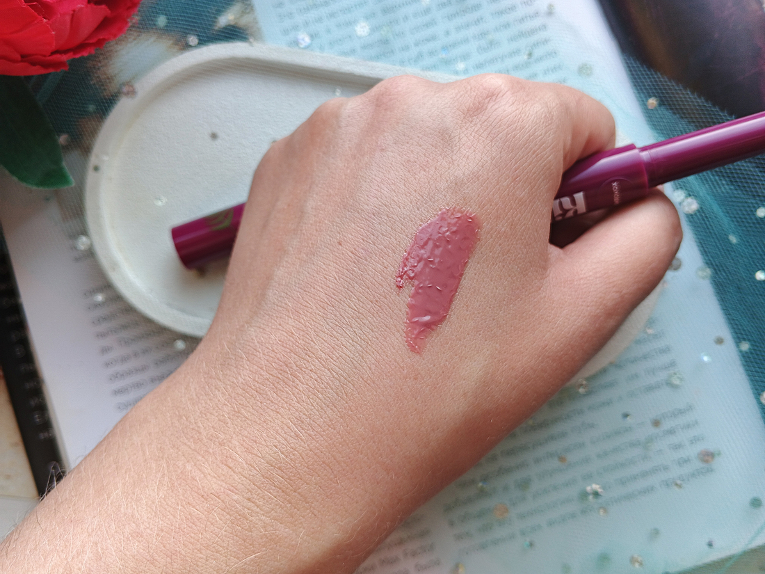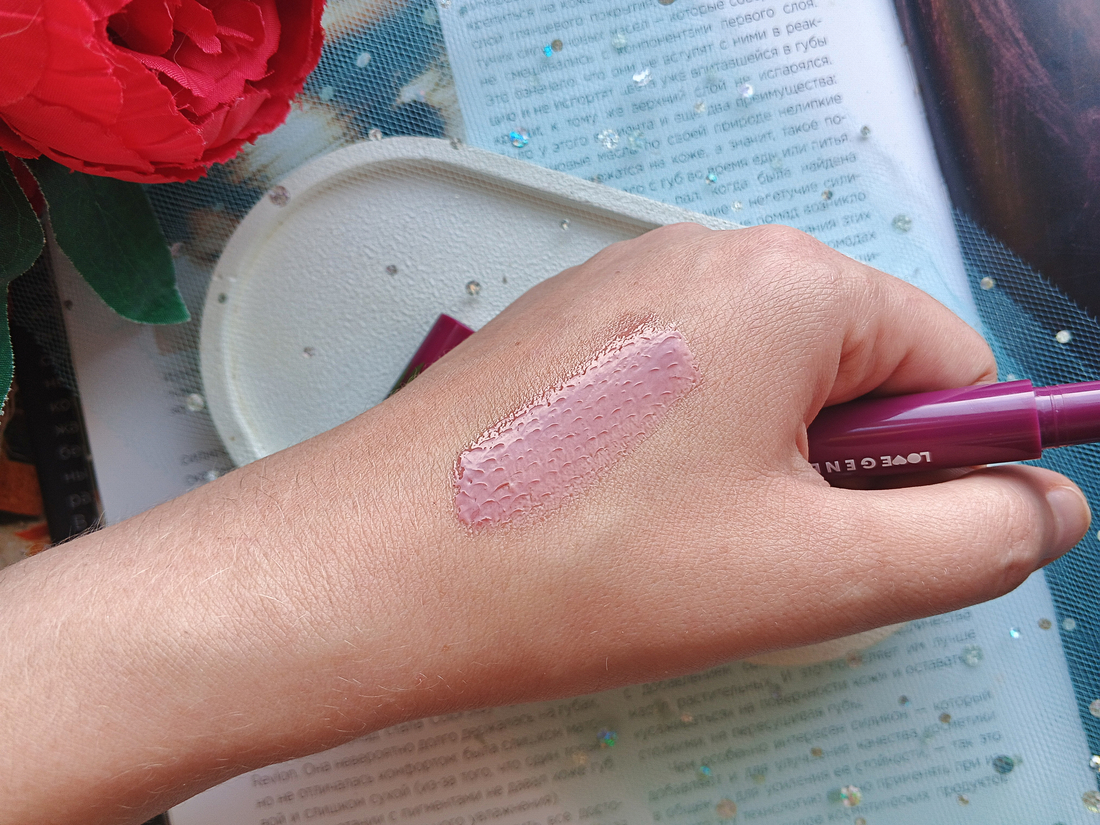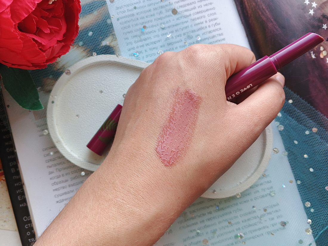 Текстура у помады-бальзама тающая, кремовая, с влажным глянцевым финишем. На свотчах выглядит красиво.