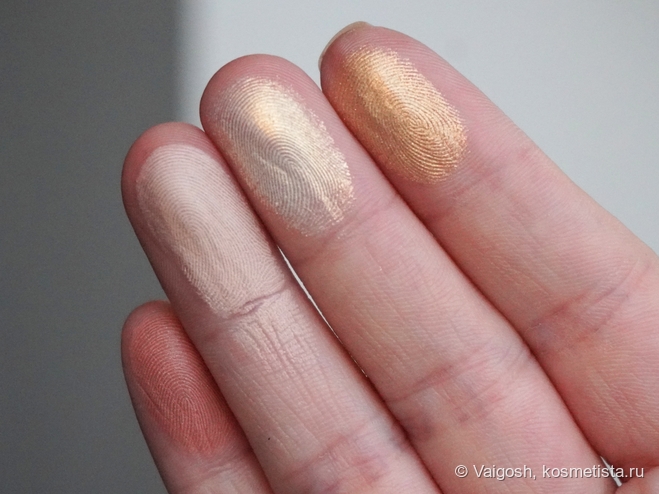 О, хайлайтер с бронзером у меня всего один, но красивая штука — сил нет) а Вика их пощупала и сказала, что для неё они слишком блестящие, так что я бы советовала на них живьём сперва взглянуть, если есть возможность.