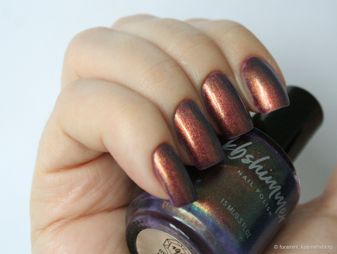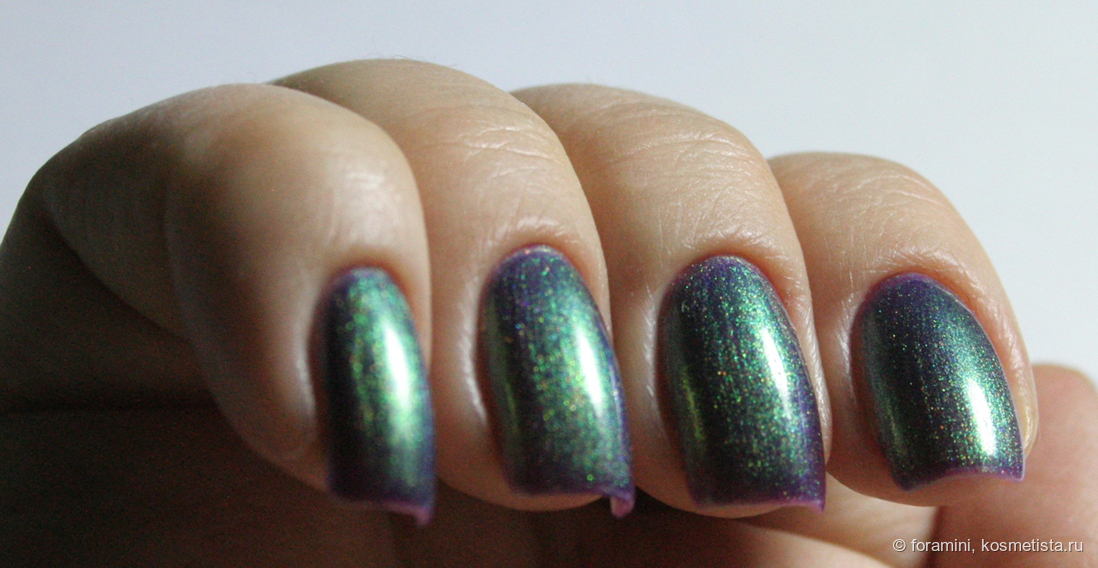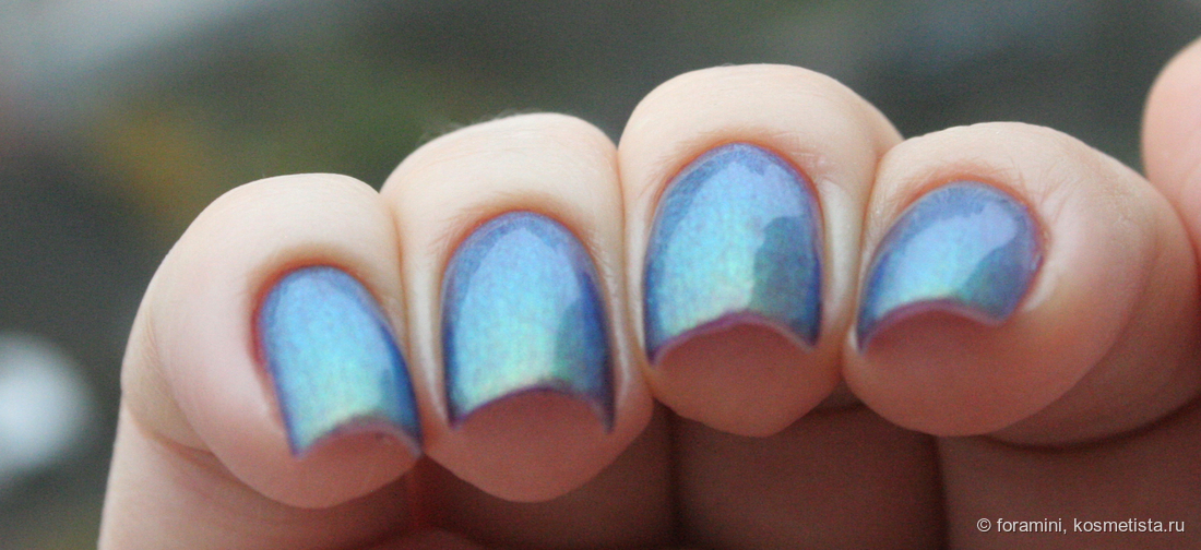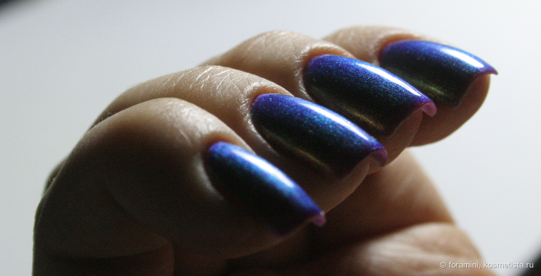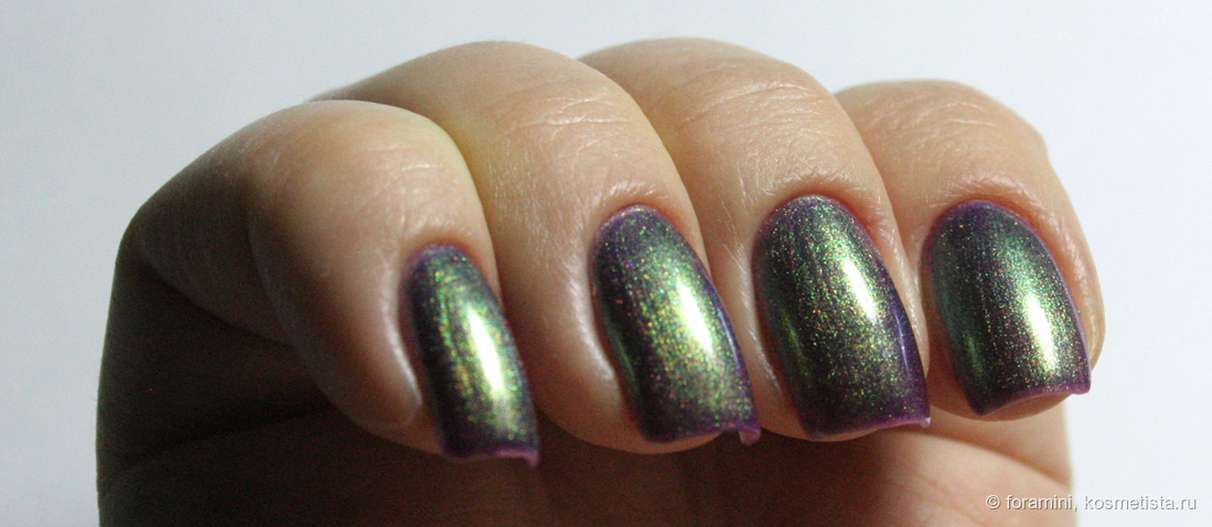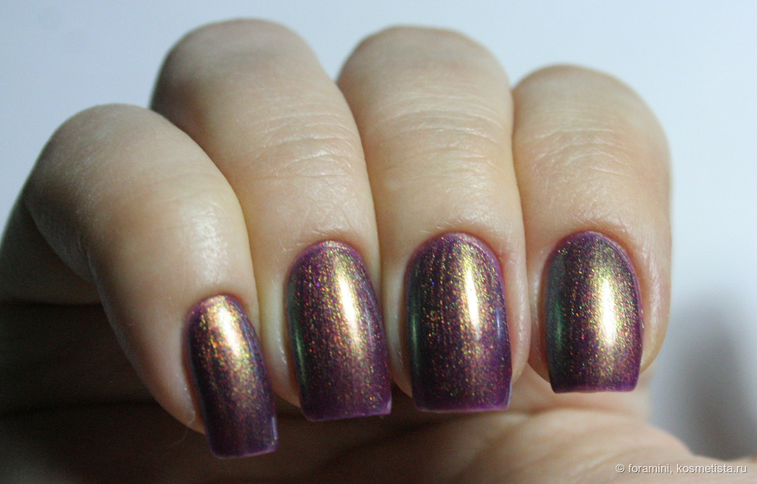 Цвет базы лака — теплый фиолетовый, в ней присутствует мультихромный шиммер, который переливается во все цвета радуги, от красного до синего, и даже чуть-чуть в фиолетовый. Он всегда разный, переливы отличаются при дневном и электрическом свете. Когда я его накрасила, то поняла, откуда такой ажиотаж вокруг этого лака.