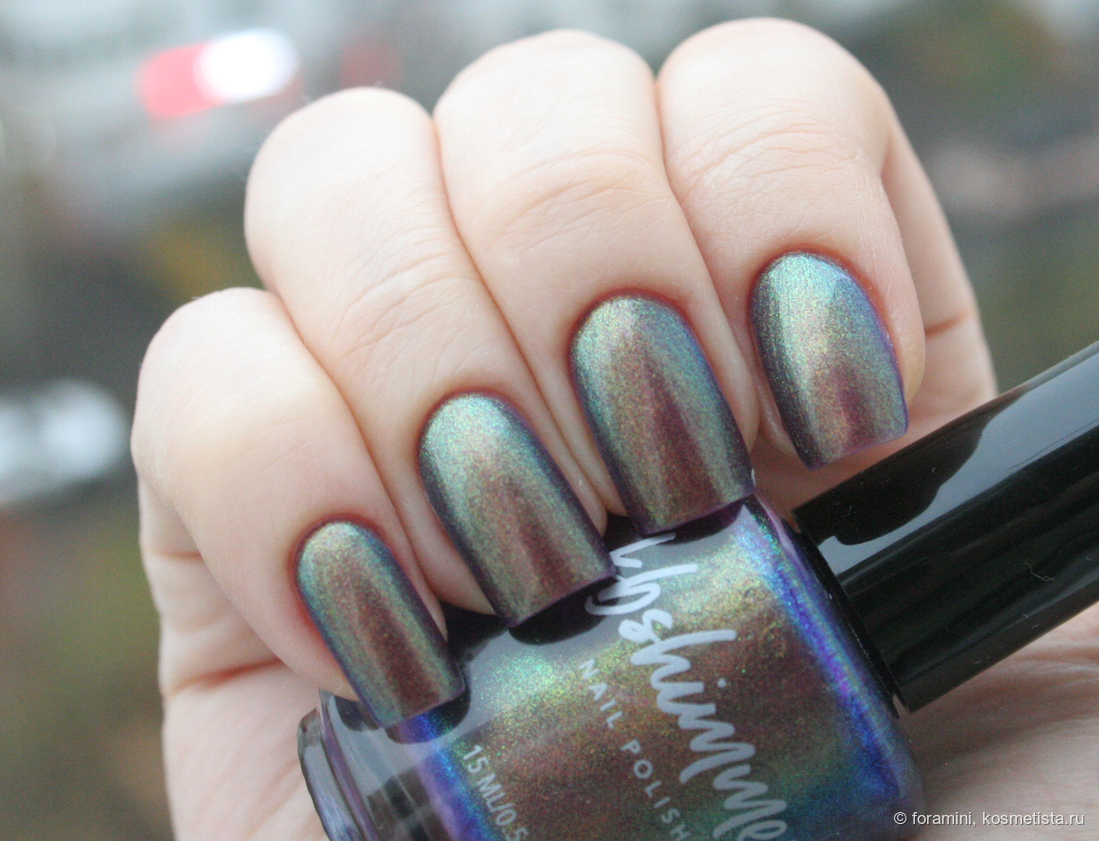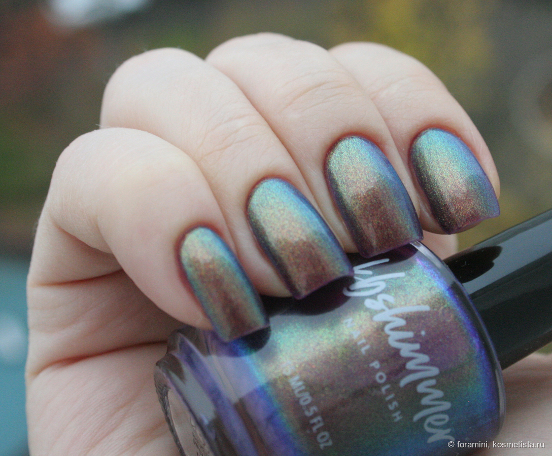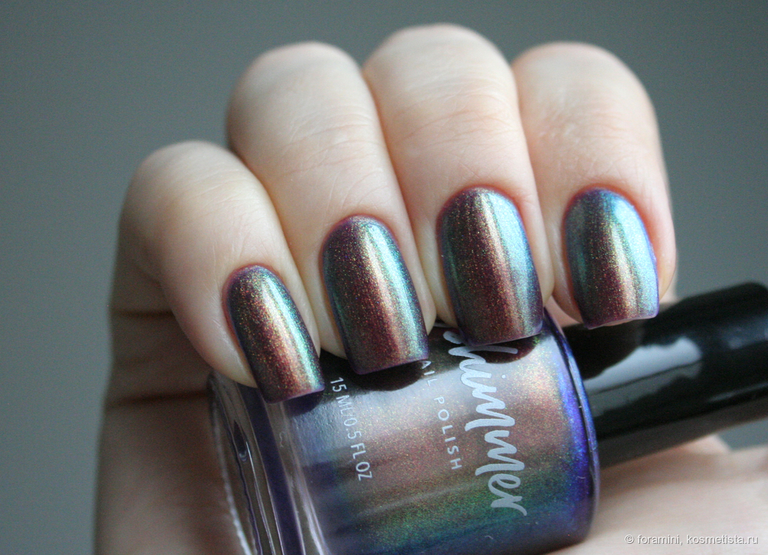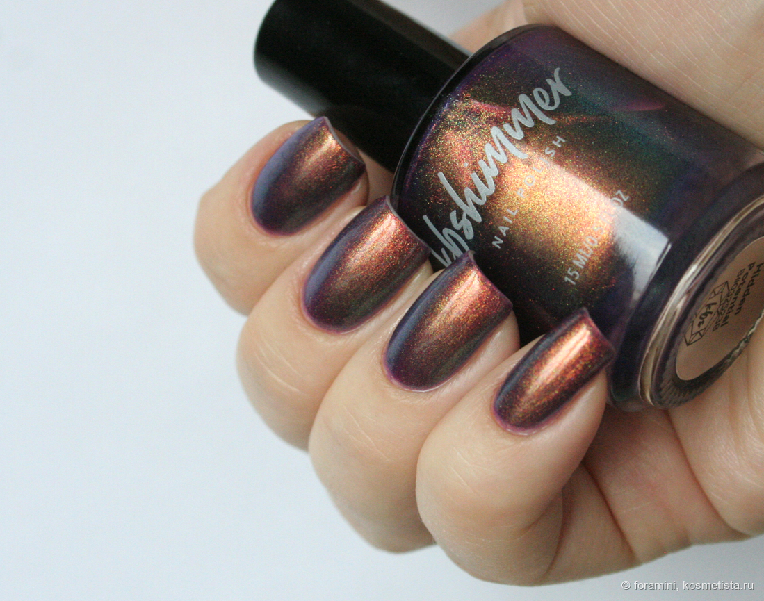 Цвет базы лака — теплый фиолетовый, в ней присутствует мультихромный шиммер, который переливается во все цвета радуги, от красного до синего, и даже чуть-чуть в фиолетовый. Он всегда разный, переливы отличаются при дневном и электрическом свете. Когда я его накрасила, то поняла, откуда такой ажиотаж вокруг этого лака.