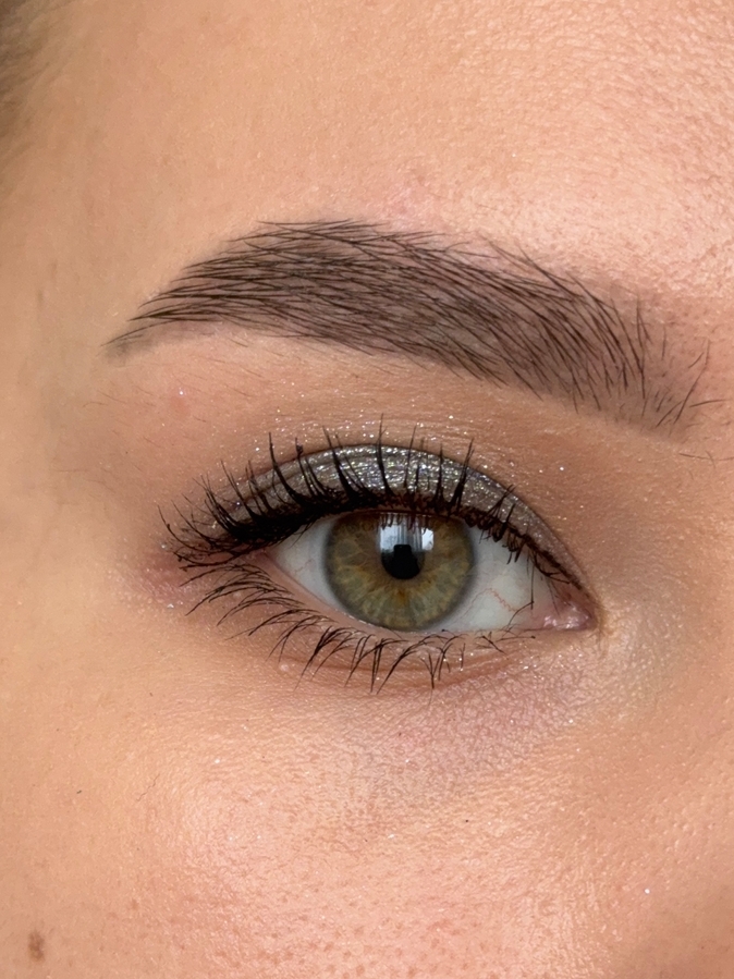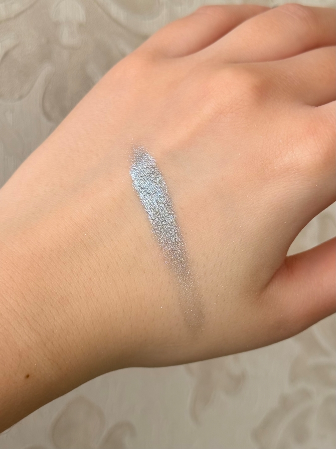 Оттенок 03 «Серебряное сияние» — серебристо-зеленые блестки на серой подложке. Очень интересный и не плоский оттенок, смотрится необычно. Очень хорош в темных макияжах или смоки. Очень выделяет глаза и прям делает акцент на них.
