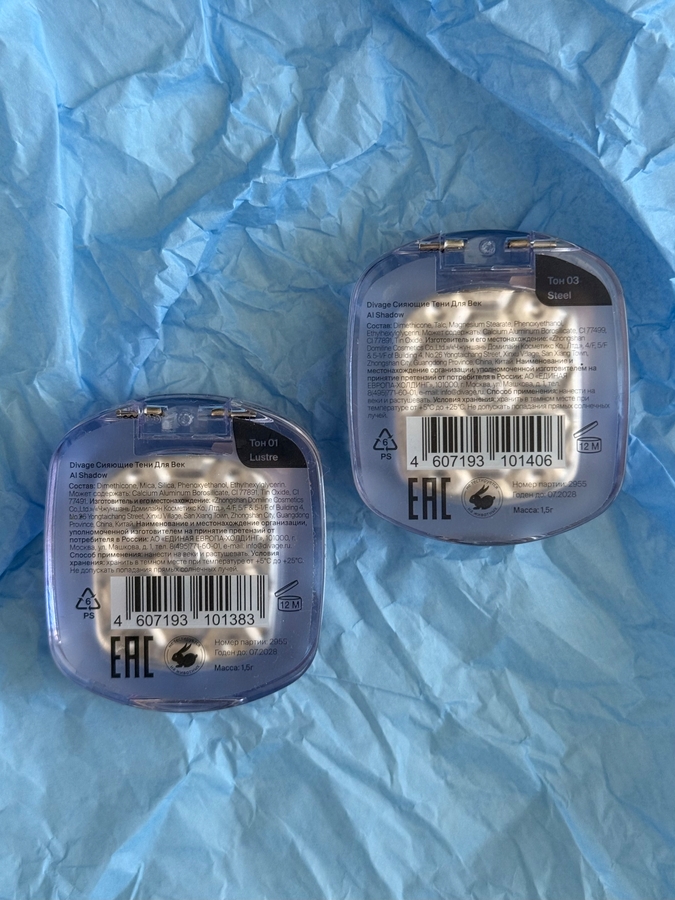 Текстура у теней чуть влажная, мягковатая. Думаю, что это нужно для «скрепления» и прессовки глиттера, чтобы он просто не рассыпался. в составе есть как крупные блестки, так и мелкий шиммер. Причем, на ощупь пальчиками я их достаточно хорошо ощущаю. Финиш у них влажный и очень сияющий.