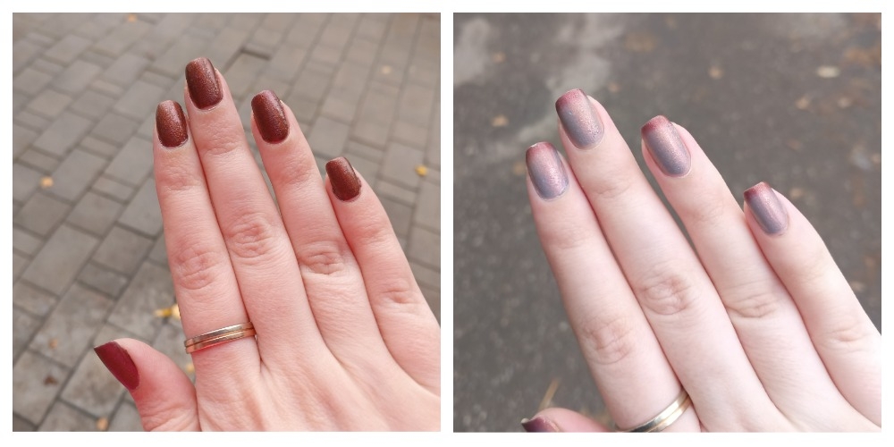 На коллаже выше слева фото в холодный день, лак полностью стал бордовым. Слева фото в более теплый день, потемнели только кончики ногтей.