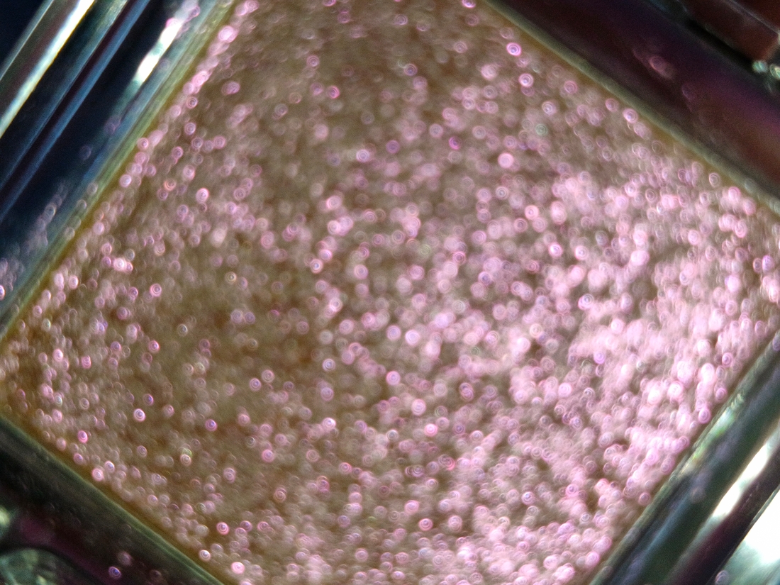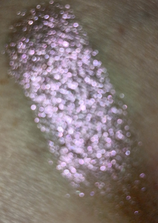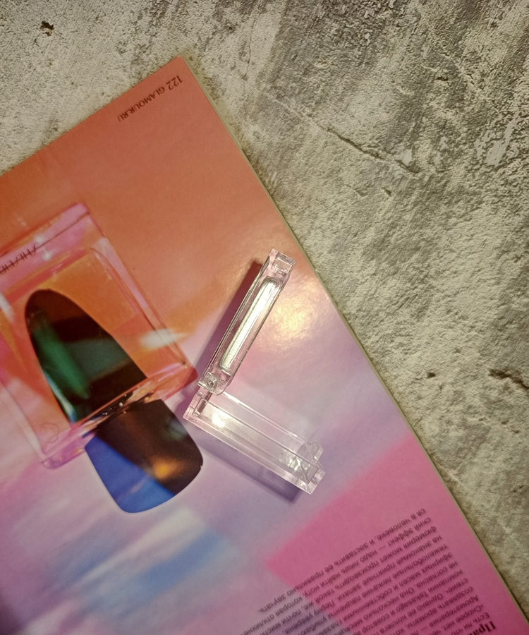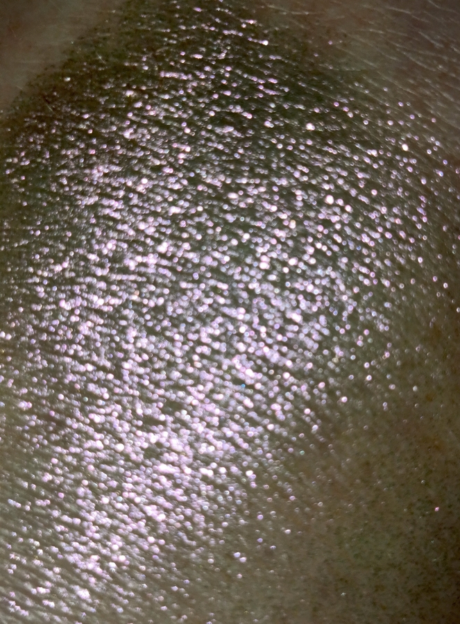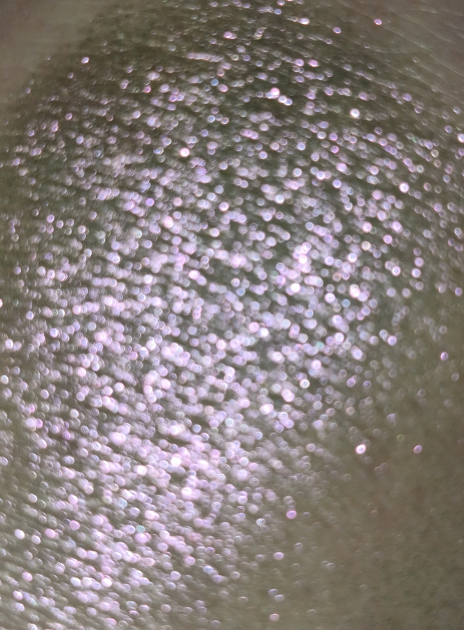 Если совсем присмотреться, то можно увидеть как будто намек на серую базу, но ее там нет вообще. Блестки, к слову, мельчайшие и на глазах вообще не ощущаются, да и невооруженным глазом их не различишь. Они сияют только при наличии яркого иточника света. Моя камера не справляется со всеми этмими переливами и сверканиями иприходится все ловить в расфокусе.
