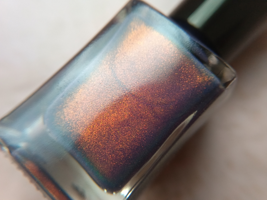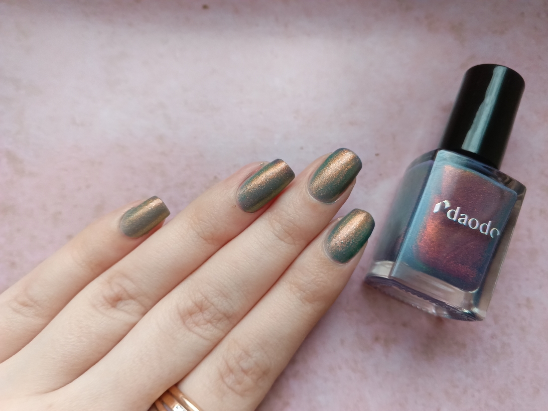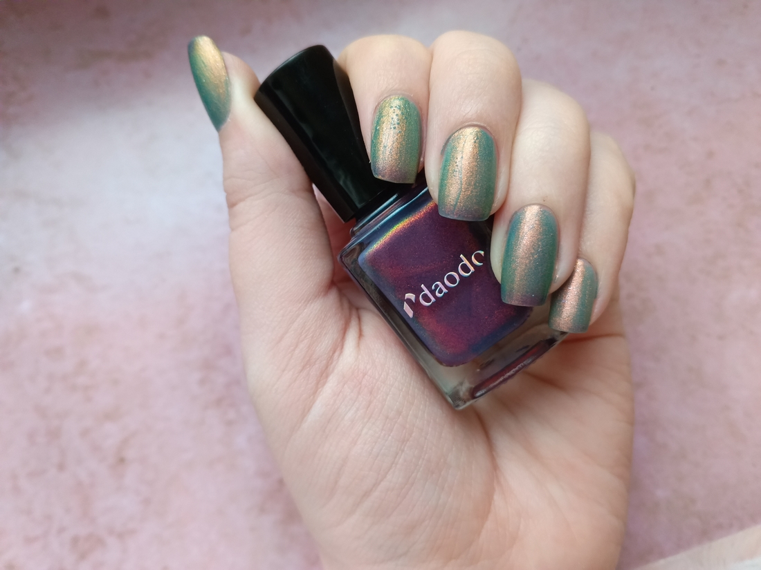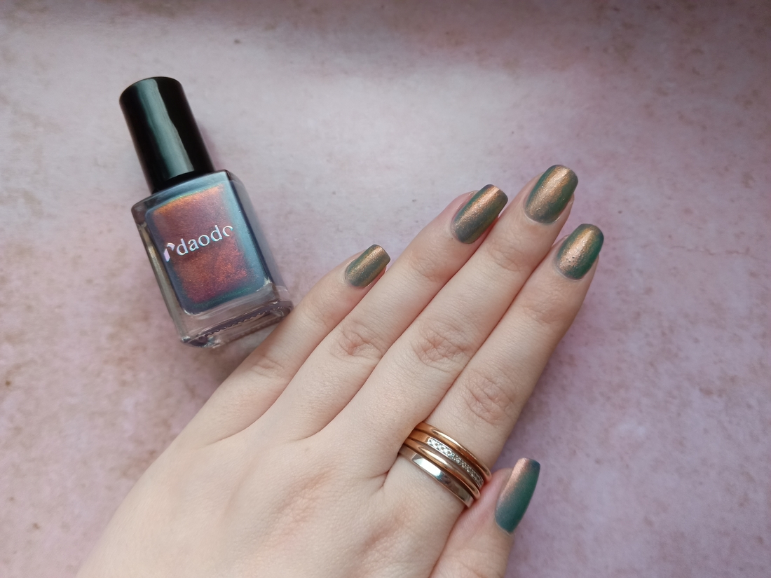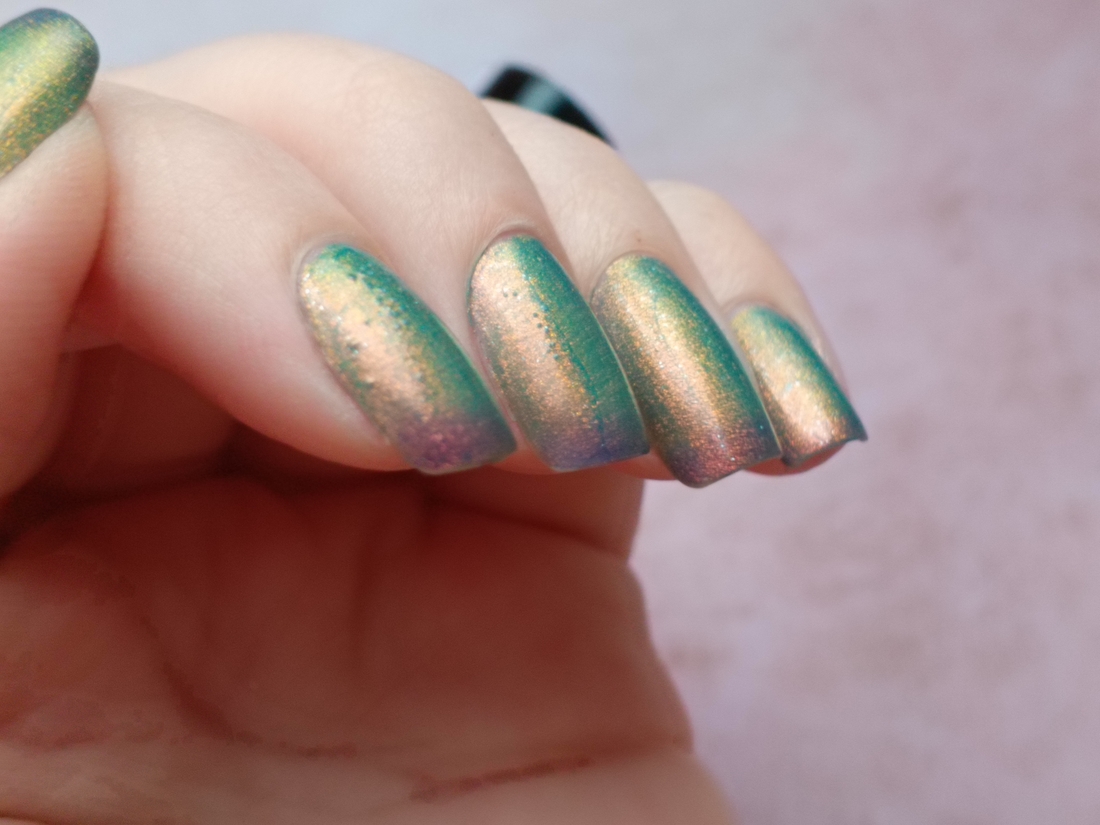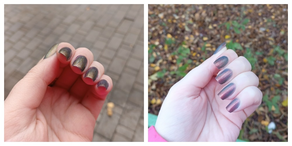 Оттенок заявлен как сине-зеленый мультихром с эффектом термо и зелено-золотисто-бронзовым эффектом аврора. В официальном описании намешано много цветов. По сути лак бледно-зеленый, с бронзовым мультихромным переливом. А термо эффект получается розово-бронзовый или даже лилово-бронзовый. По краям можно заметить отголоски синего и фиолетового, но этого практически не будет заметно в жизни.