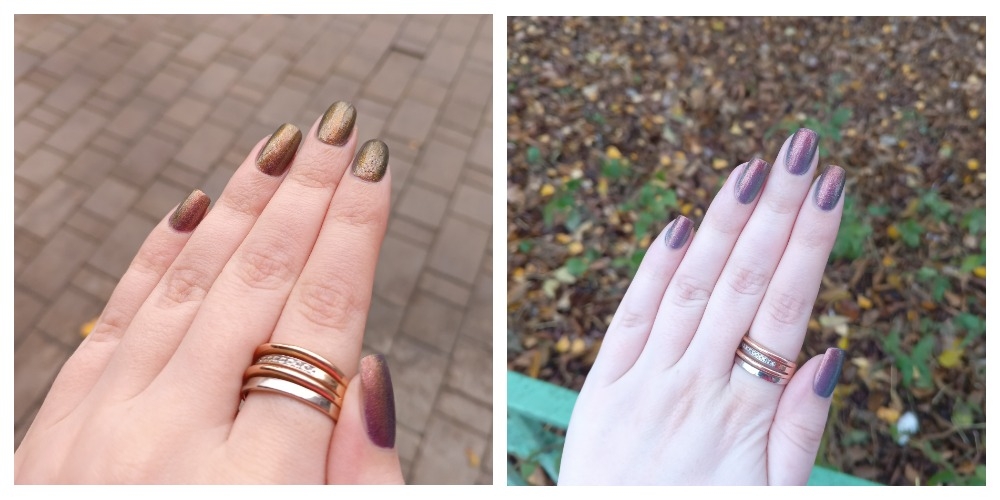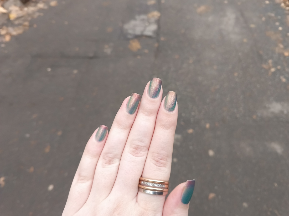 На фотографии ниже все эффекты лака видны. И мультихром и эффект термо и аврора. Сложный замес, я понимаю почему лак стоит дороже других в своей линейке. Но и не думаю, что хотела бы покупать его за полную цену.