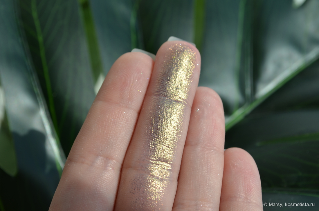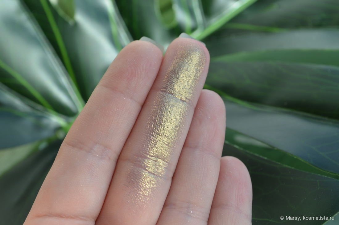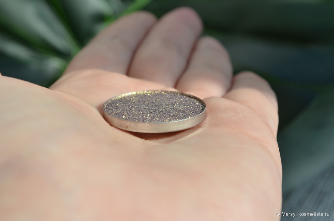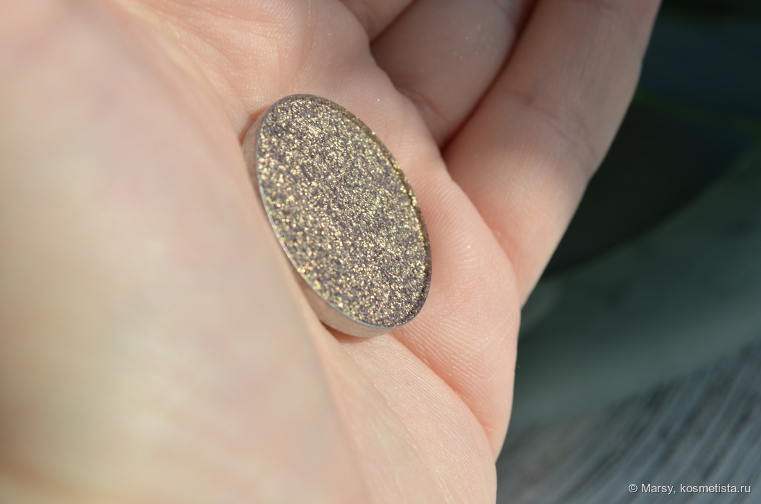 Оттенок потрясающий. Это состаренное золото с переливом плесневелой зеленцы и фиолетового. Хотя, я бы сказала, что у оттенка фиолетовая база, она видна при определенном угле. Выглядит невероятно интересно и по — вечернему.