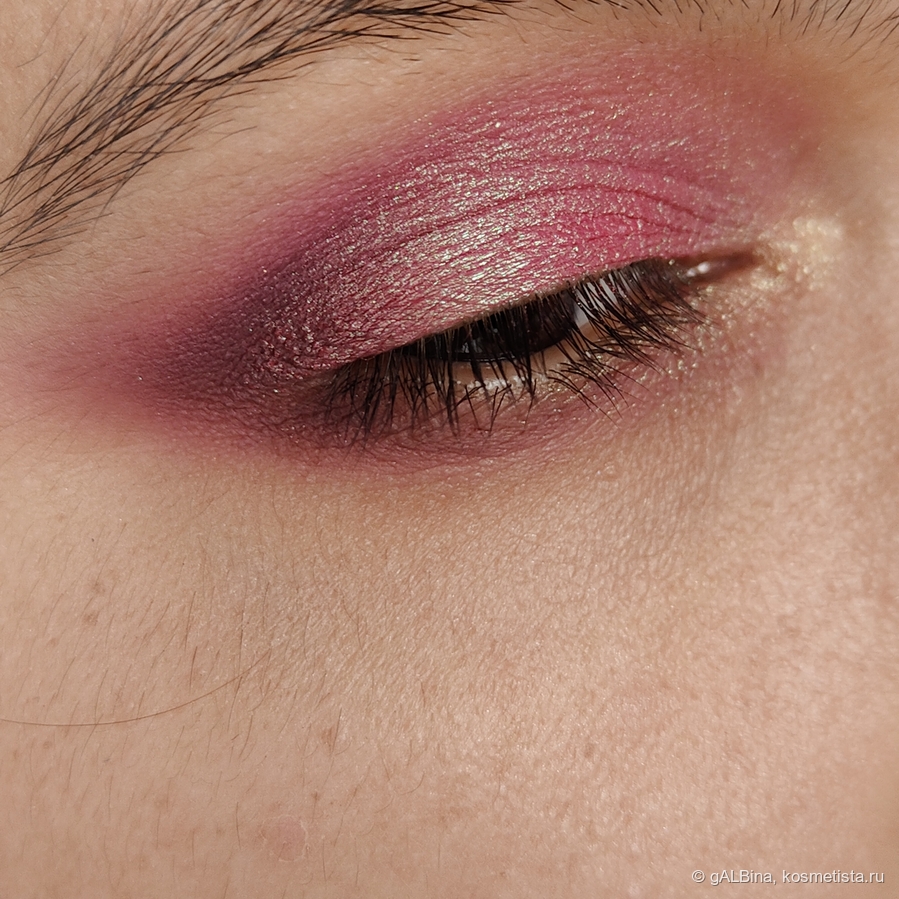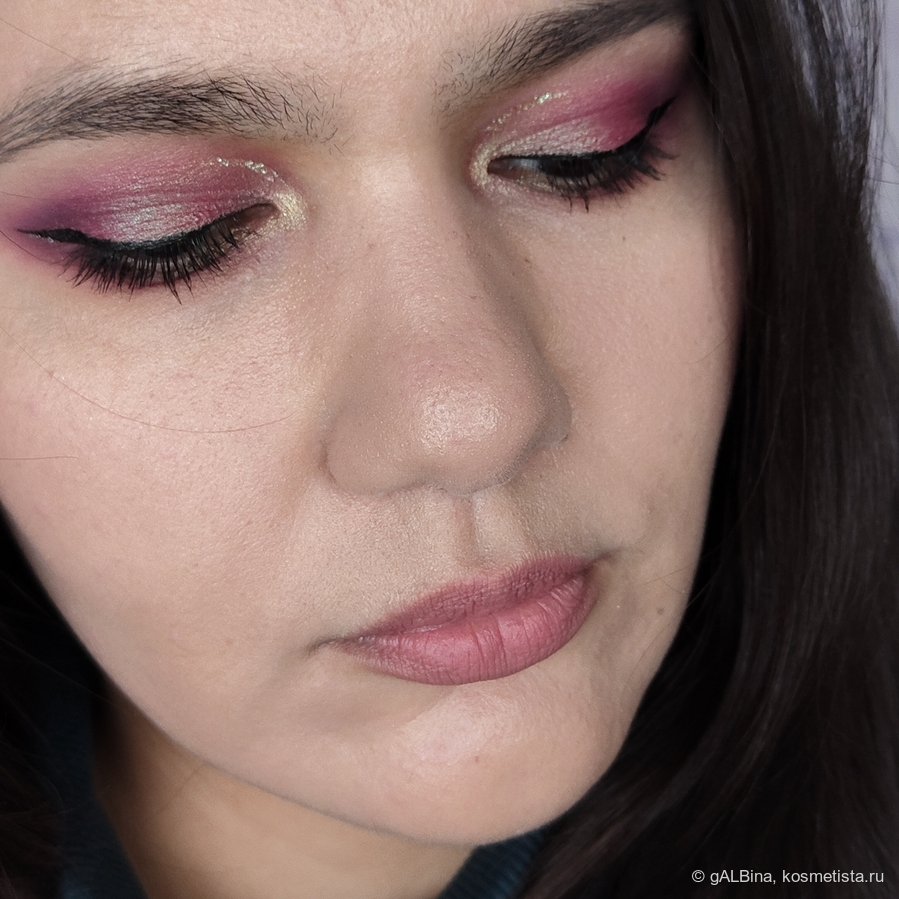 Работать с оттенком довольно легко. Я наношу на обычную базу под тени. В течении дня ведёт себя отлично. Не скатывается и не забивается в складку века.