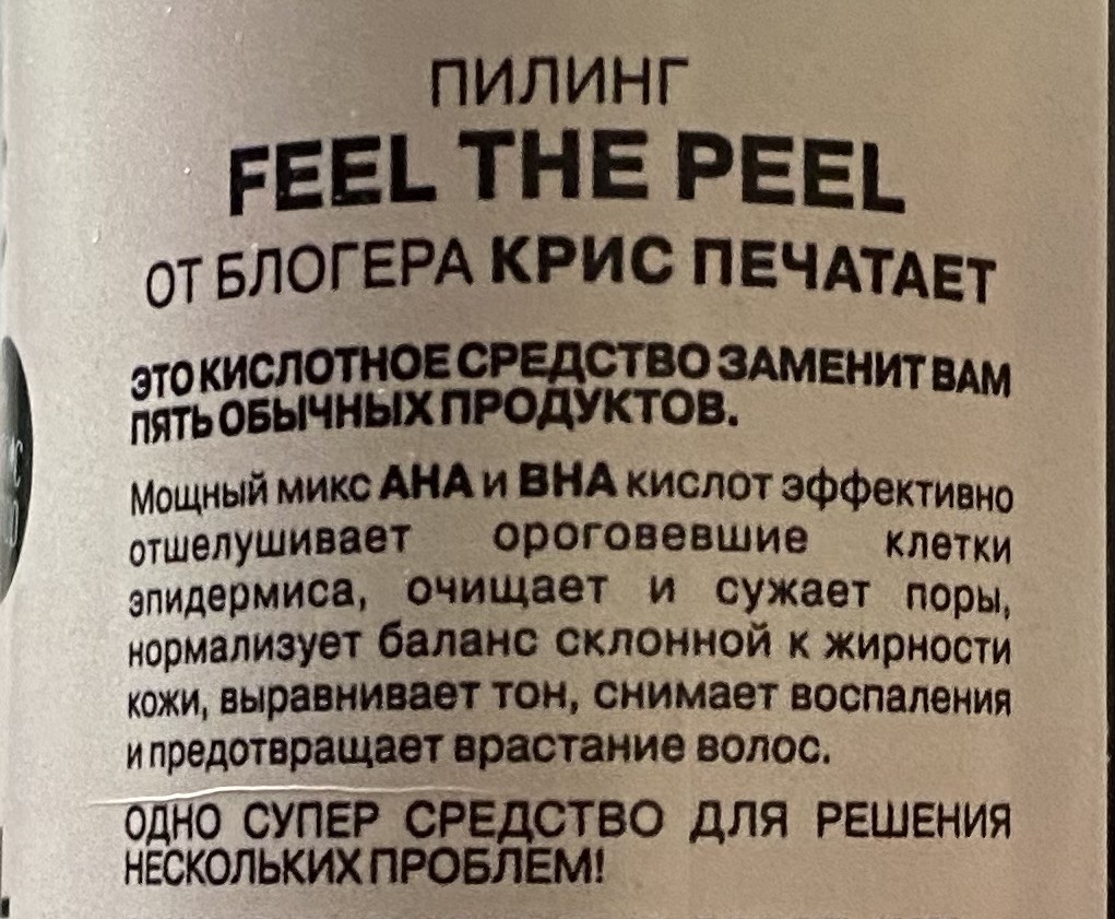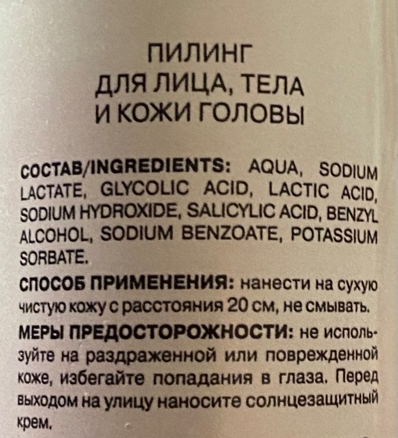 Это средство позиционируется как многофункциональный кислотный пилинг для лица, тела и кожи головы. Пилинг должен удалять ороговевшие клетки, нормализовать выработку себума, снимать воспаление, предотвращать врастание волос. В общем, “всё-в-одном”.