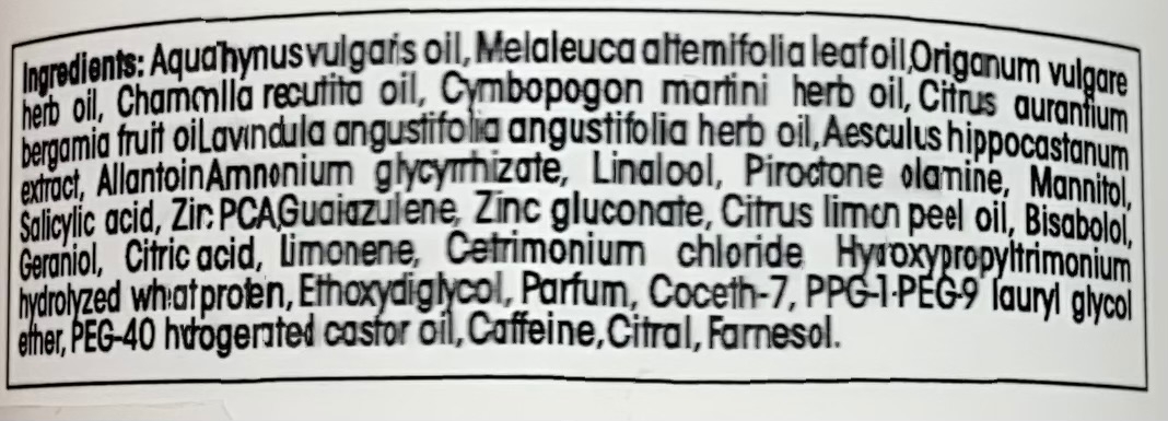 В составе много масел (Мирта, Кипариса, Бергамота и Пальмарозы) и растительных экстрактов, которые эффективно борятся с проявлениями перхоти, регулируют работу сальных желез, обладают антисептическими свойствами. Бисаболол и Азулен успокаивают и защищают кожу головы, снижая воспаления. Салициловая кислота и пироктон оламин в сочетании с эфирными маслами оказывают антимикробное действие, мягко отшелушивают ороговевшие клетки и поддерживают естественный баланс кожи головы. Протеины пшеницы проникают в структуру волоса, укрепляя и уплотняя его, благодаря чему волосы становятся более плотными, гладкими и блестящими.