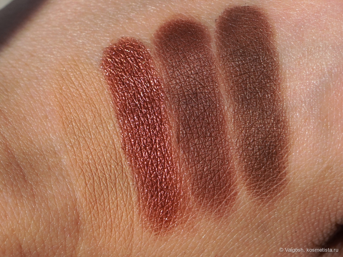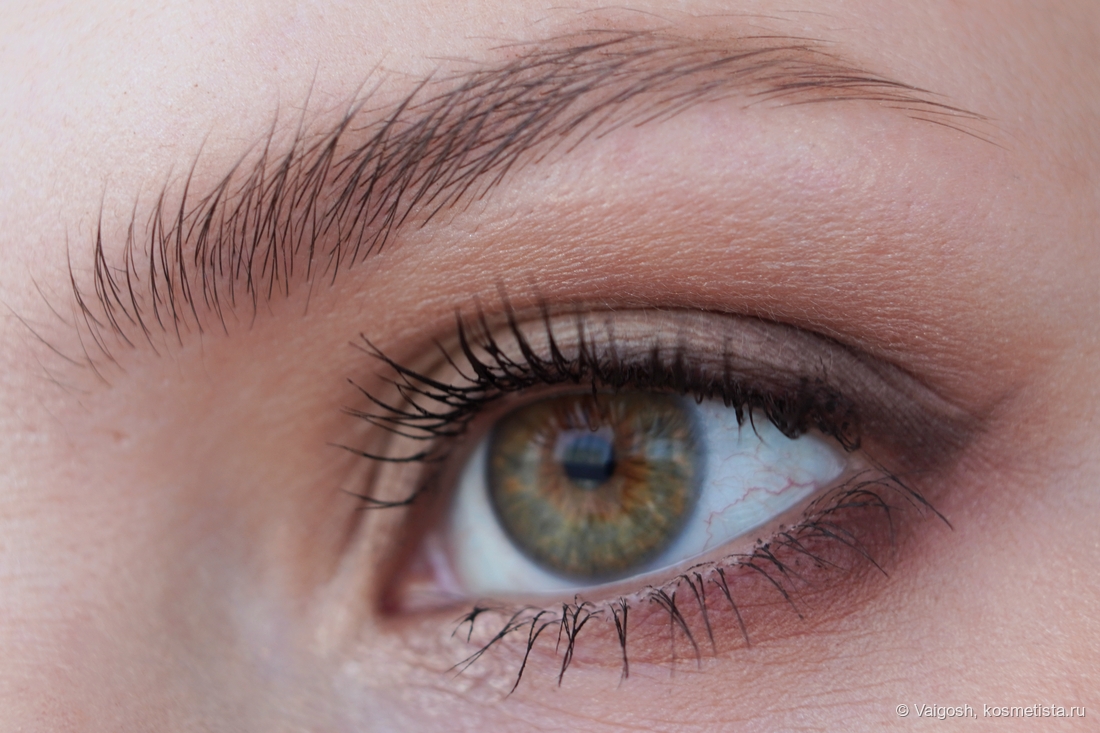 Бежевый — в растушевке, коричневый — в складке и на нижнем веке, темно-коричневый — во внешнем уголке, им же нарисовала стрелку, ну а на подвижном веке вы и сами все видите.