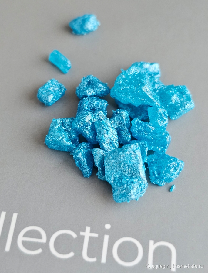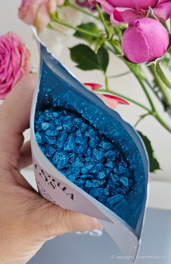 Соль состоит из гранул разного размера, очень яркого бирюзового оттенка с шиммером. При растворении окрашивают воду в голубой перламутровый цвет.