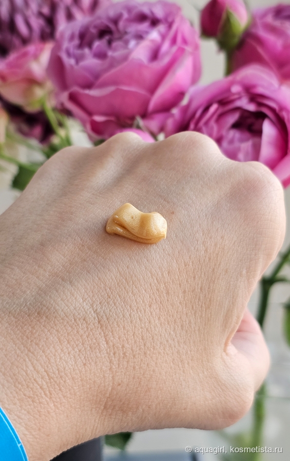 Текстура напоминает гибрид между сухим маслом и лёгким лосьоном, быстро тает от тепла кожи. Цвет золотистый с шиммером.