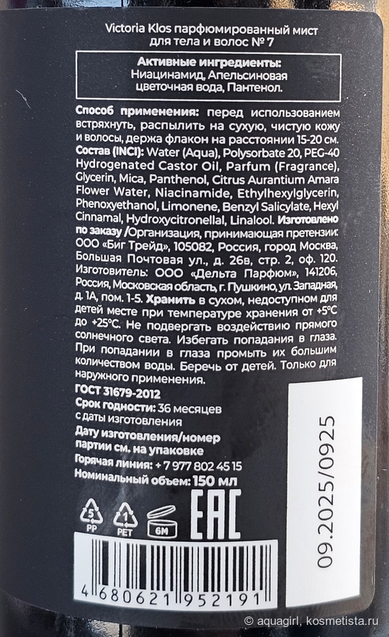 Текстура лёгкая, водянистая. На волосы мист можно наносить вместо парфюма, но лучше не увлекаться — иначе волосы могут быстрее испачкаться.