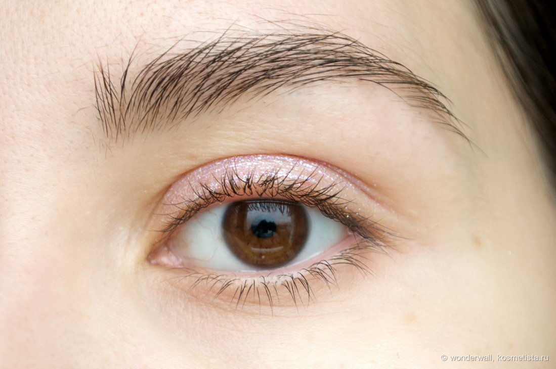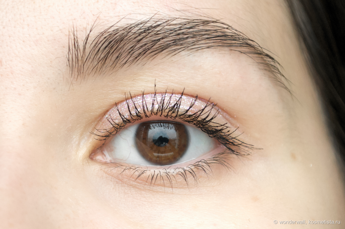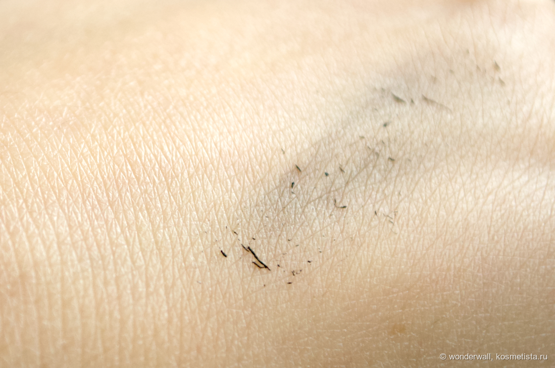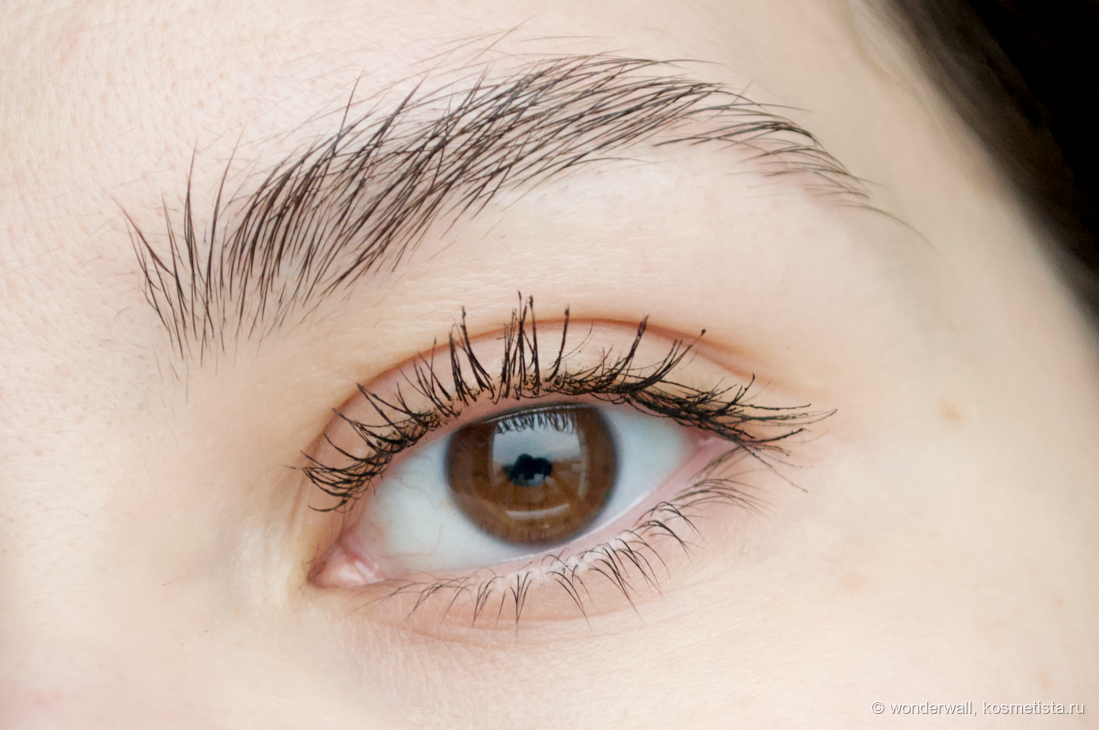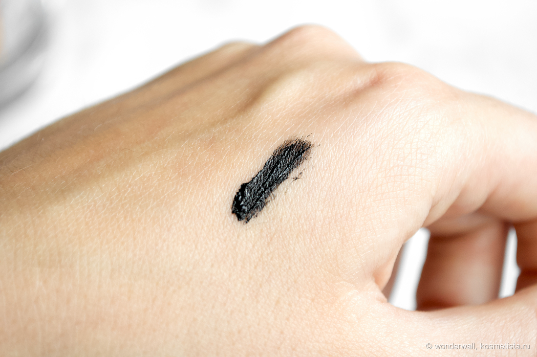 Текстура кремовая, застывает долго. Из плюсов — можно без спешки расчесать ресницы и добиться более аккуратного вида, из минусов — надо ждать, пока тушь высохнет и особо не моргать, чтобы она не отпечалась на коже.