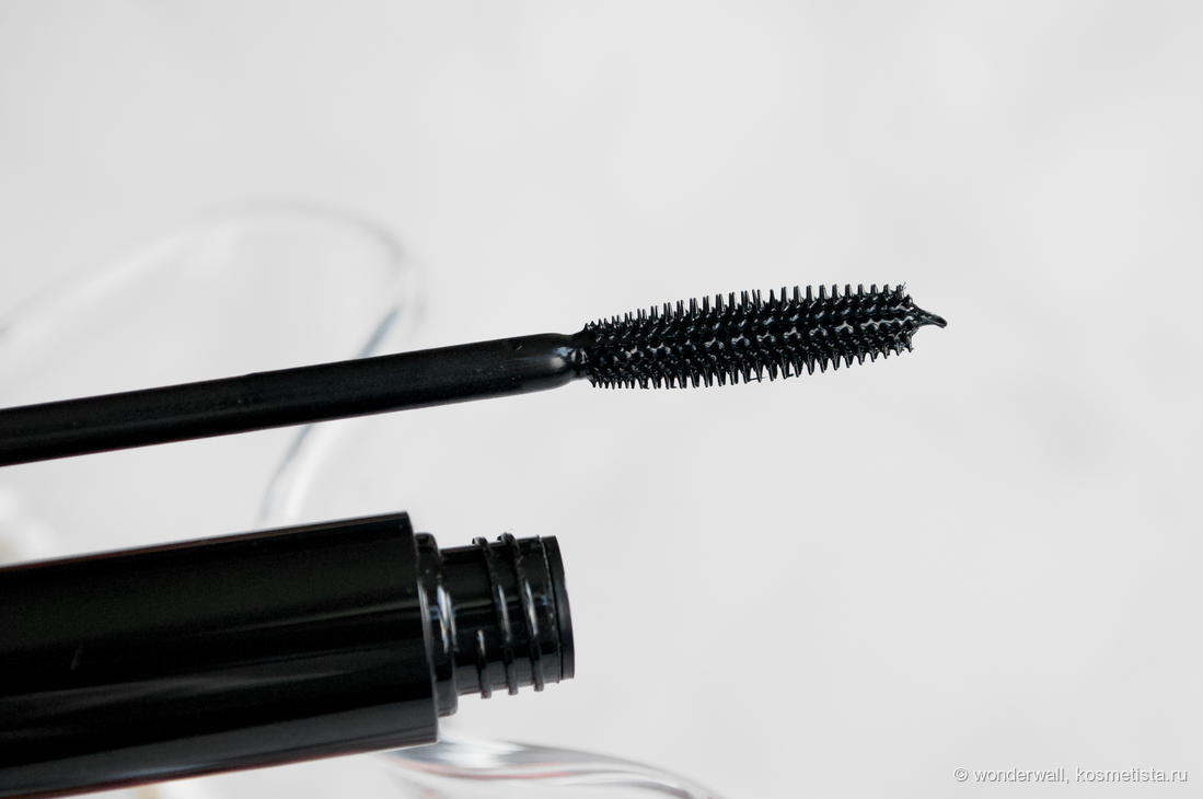 Щёточка среднего размера, сделана из силикона. Кожу век не царапает, но тушь распределяет не очень аккуратно: высока вероятность оставить небольшие следы на верхнем веке.