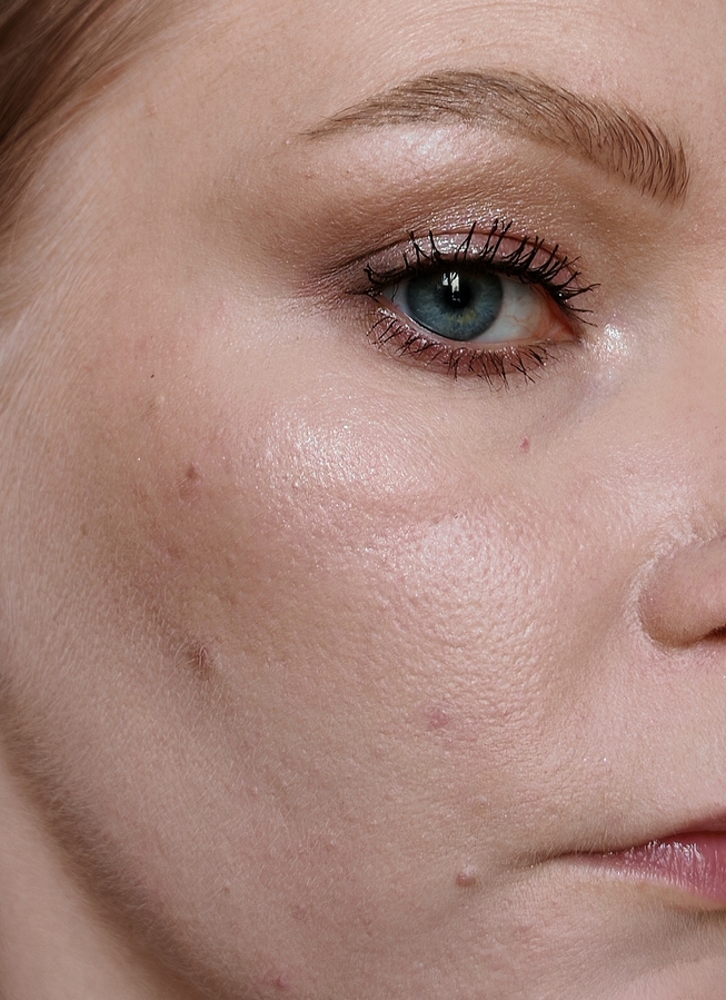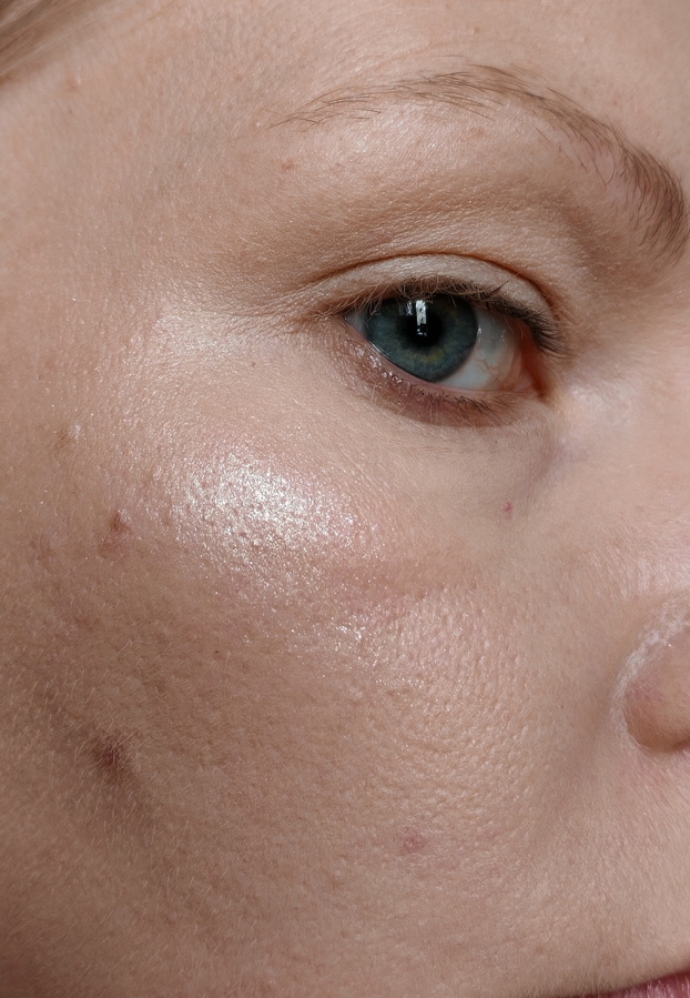 За счёт текстуры, хайлайтер немного подчёркивает недостатки кожи.