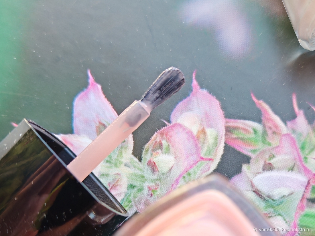 Приглушенный кремово-розовый, тоже полупрозрачный. Слился с оттенком моей кожи.