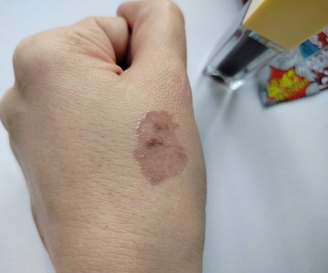 Оттенок: во флаконе очень красивый, мерцающий, шоколадный. На губах — гораздо скромнее, скорее лёгкая фиолетово-сероватая дымка.