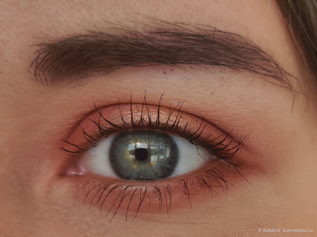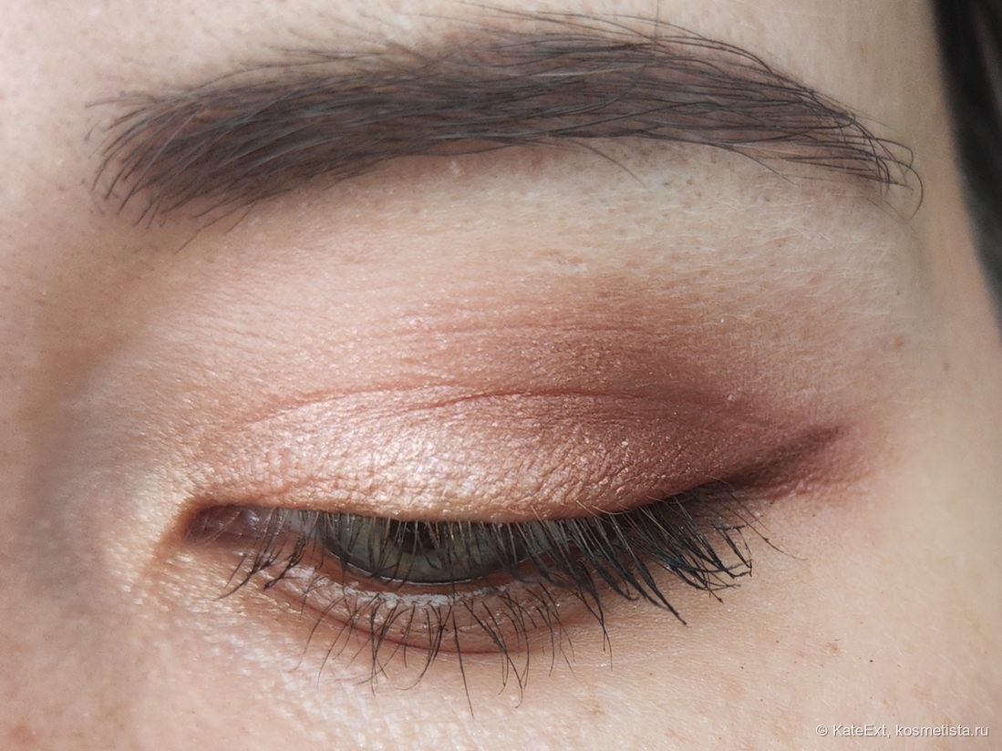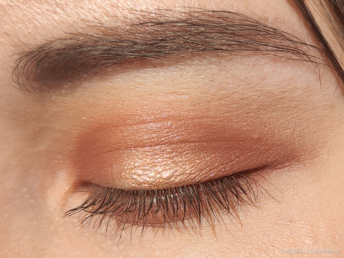Медный сатин. Да, это именно сатин, а не металлик — во всяком случае, на веке. Очень красивый оттенок, при неярком свете выдаёт классный персиковый подтон. Не скажу, что он уникален — нет, таких полно, но всё равно, красиво же!