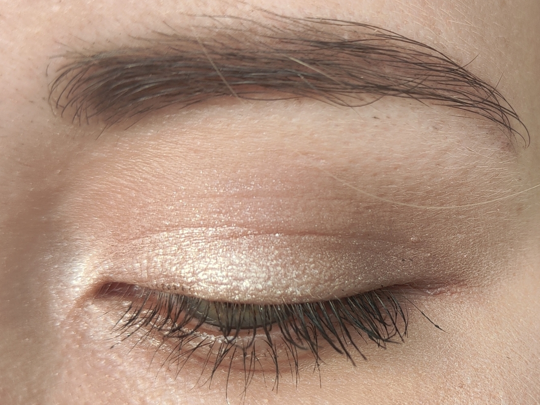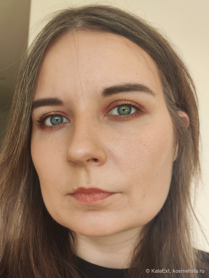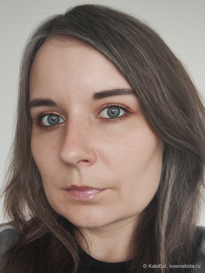 И смотрится неплохо — такой, простенький дневной нюдец, и блестяшка красиво блестит. Кажется — минутный макияж, да? А вот нет — я даже не считала, сколько времени на него убила, но непозволительно много. Потому что нужно наслаивать и наслаивать. И даже после наслаивания оттенки не то, чтобы очень уж заметны.