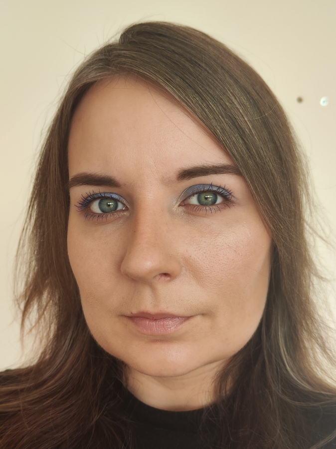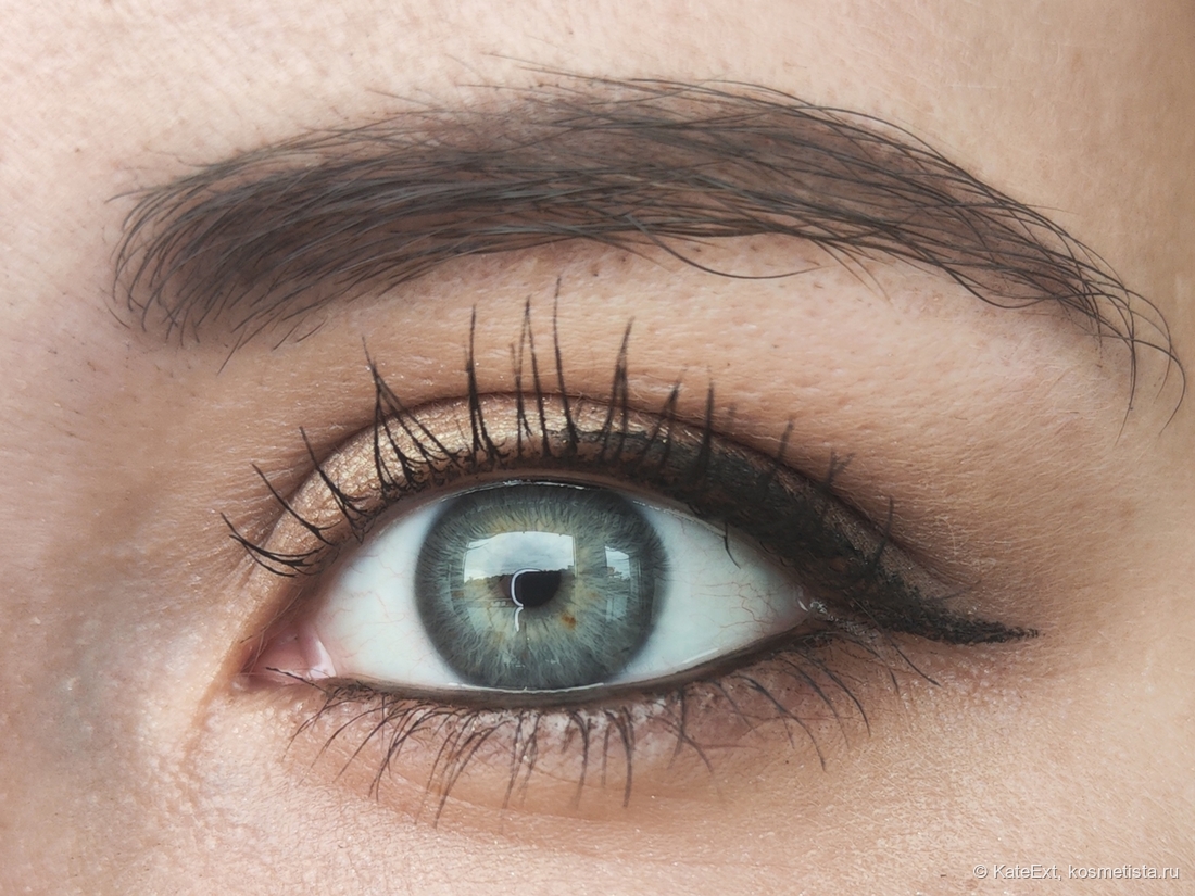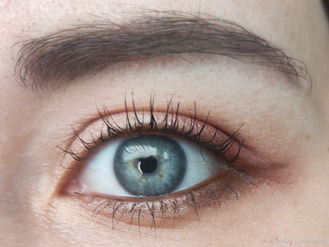 По матовым тут все один в один как в предыдущем макияже, поскольку и выбора особого нет, во внутреннем уголке — шампань, на подвижном веке серо-голубой сатин. И вы просто посмотрите, насколько он хорош! И с шампанью смешался идеально, и в матовый втушевался безпроблемно, и сам по себе красивый невероятно. Да, блестит не так активно, как шампань, но я и не ждала от сатина блеска, как у шимера.