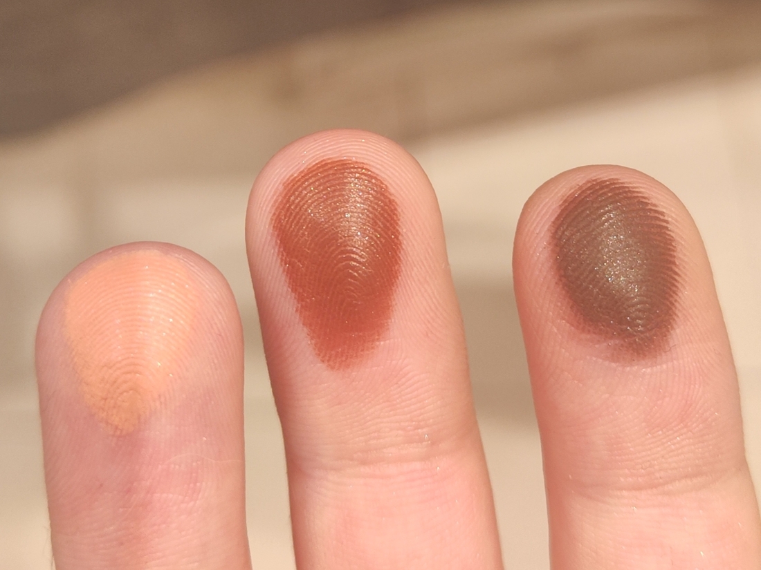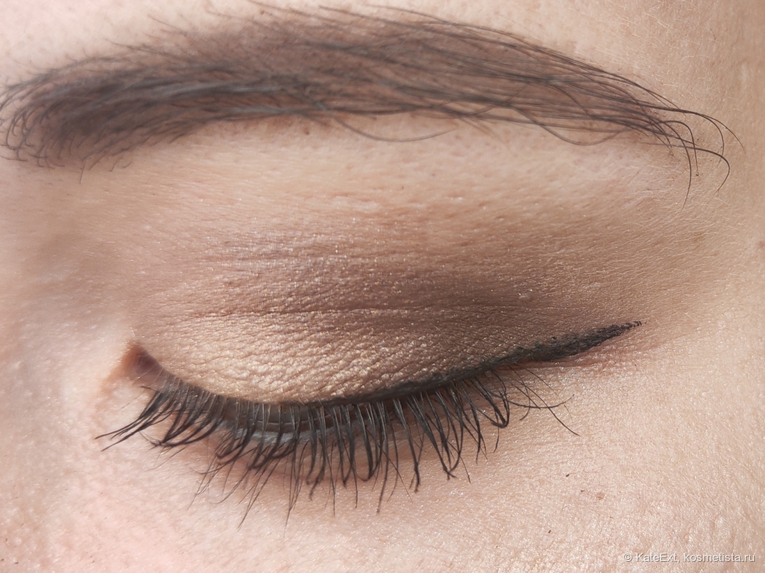 Здесь в складке кирпично-розовый, во внешнем уголке и на нижнем веке — самый тёмный коричневый в миллион слоев, на всем подвижном веке и во внутреннем уголке — шампань. Ну и по умолчанию: база прибита бежевым. Каким именно? Понятия не имею, они абсолютно одинаковые невидимо-матовые.