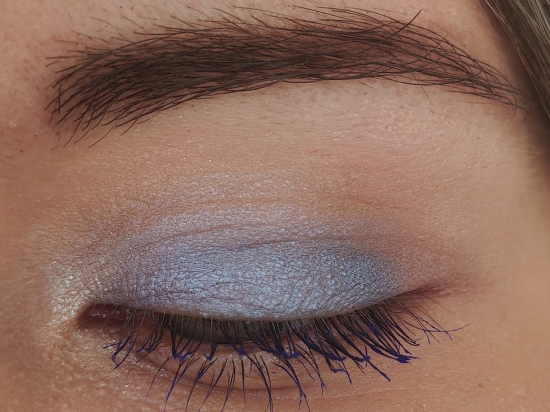 Серебряно-голубой сатин. Любимый в этой палетке, да и вообще, наверное, любимый голубой сатин эвер. Мягонький, не сыпется, не стягивает веко, блестит-сияет. Оттенок больше всего напоминает ледники под солнцем, он очень многогранный — в нём есть и серебристые нотки, и голубые, и даже лавандовые нет-нет, да проскочат. Однако всё это перекрывает один жирный минус — он скатывается. Я такого оооочень давно не встречала, но да, даже на базе он стирается с века и оседает в складках. А это непростительная беда.