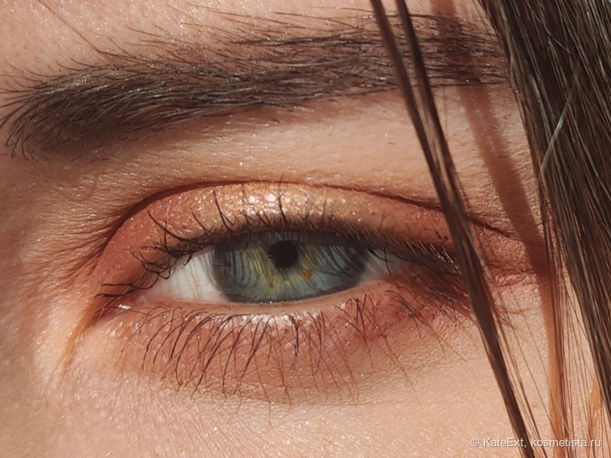 В складке — персик, во внешнем, внутреннем уголке и на нижнем веке — терракота, в центре подвижного века — медь. Тут выглядит не слишком впечатляюще, поэтому я выползла на солнышко, чтобы показать, как оно дивно сияет. Воть: