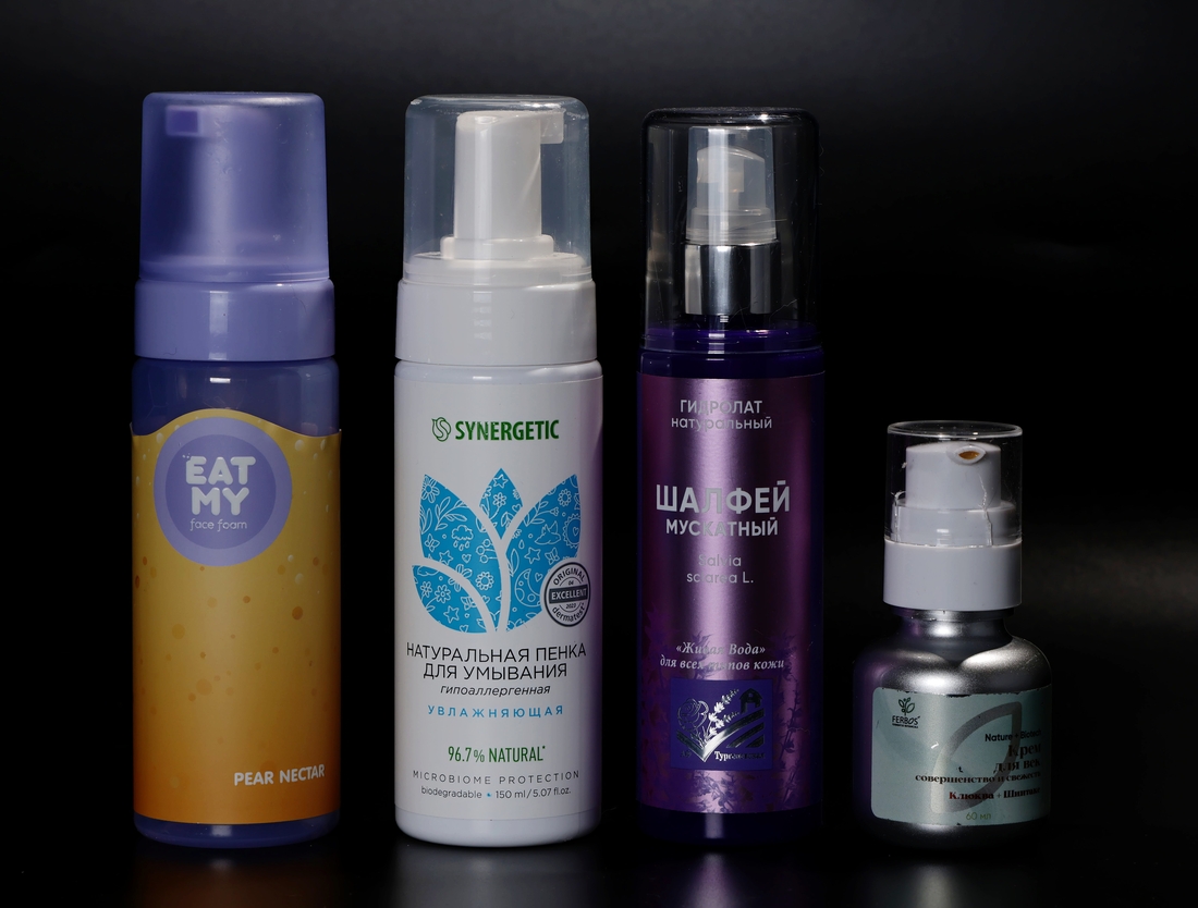 Тут немного неожиданно две пенки для умывания (пенки мы используем вдвоем дома), гидролат и крем для век.