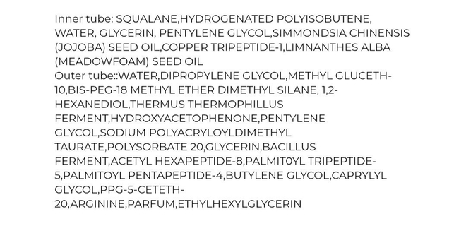 - В составе органический кремний, пробиотики, масло ши, аминокислоты, медный пептид, флавоноиды, экстракт акмеллы, пептиды син-колл, аргирелин, синяк (syn-ake), аллантоин, коллаген.