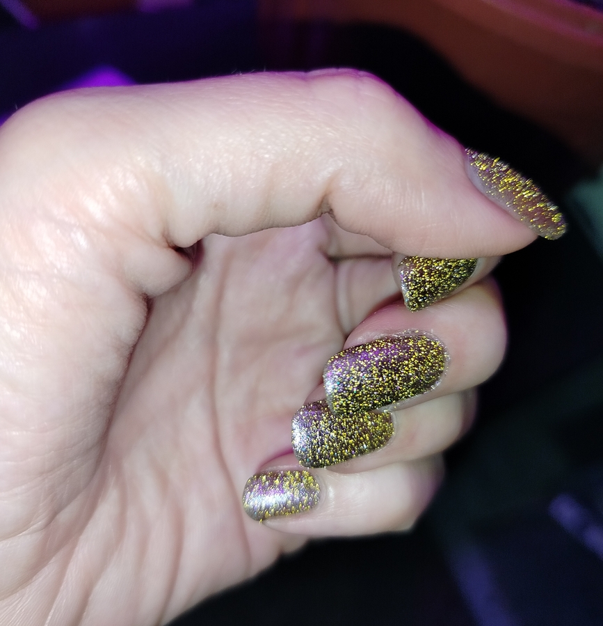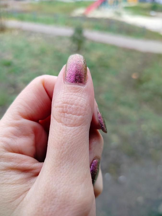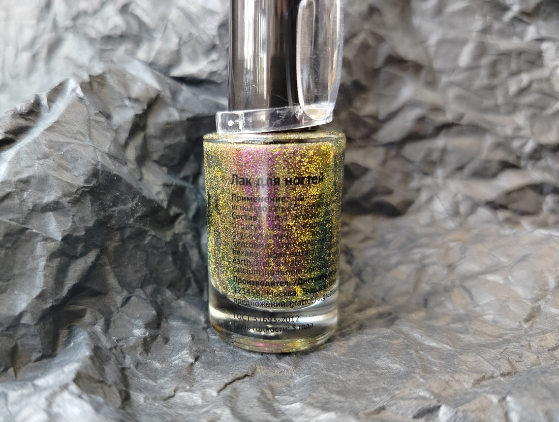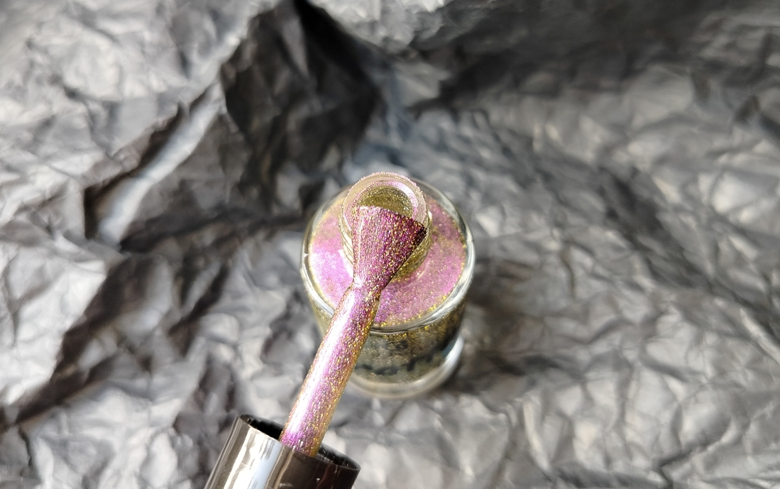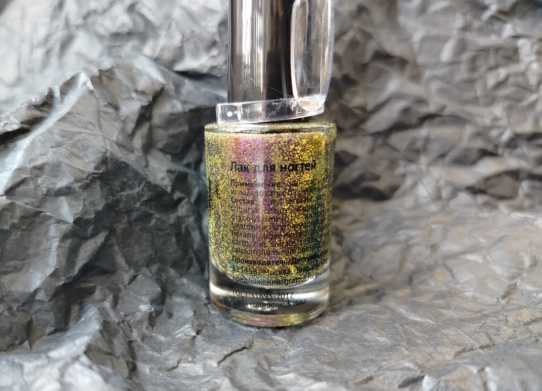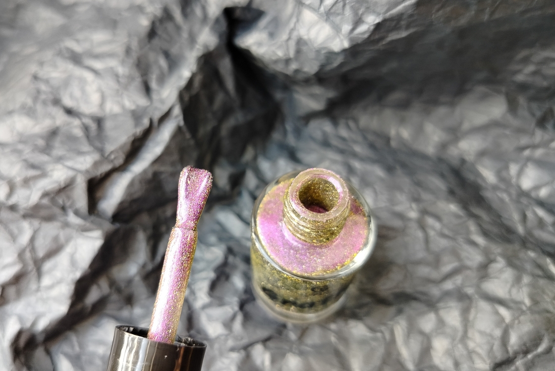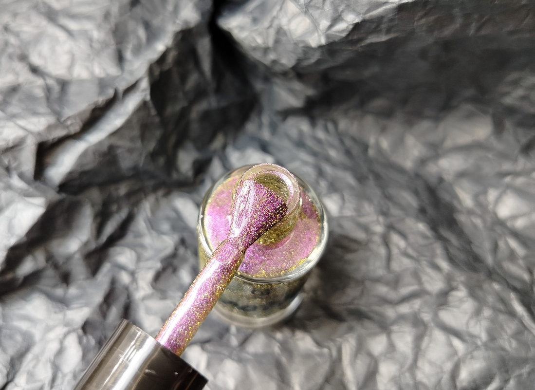 Во флакончике оттенок невероятно красивый и захватывающий — прозрачный с золотым светоотражающим глиттером и мультихромным шиммером (фиолетово-розово-оранжево-золотой с зеленым).