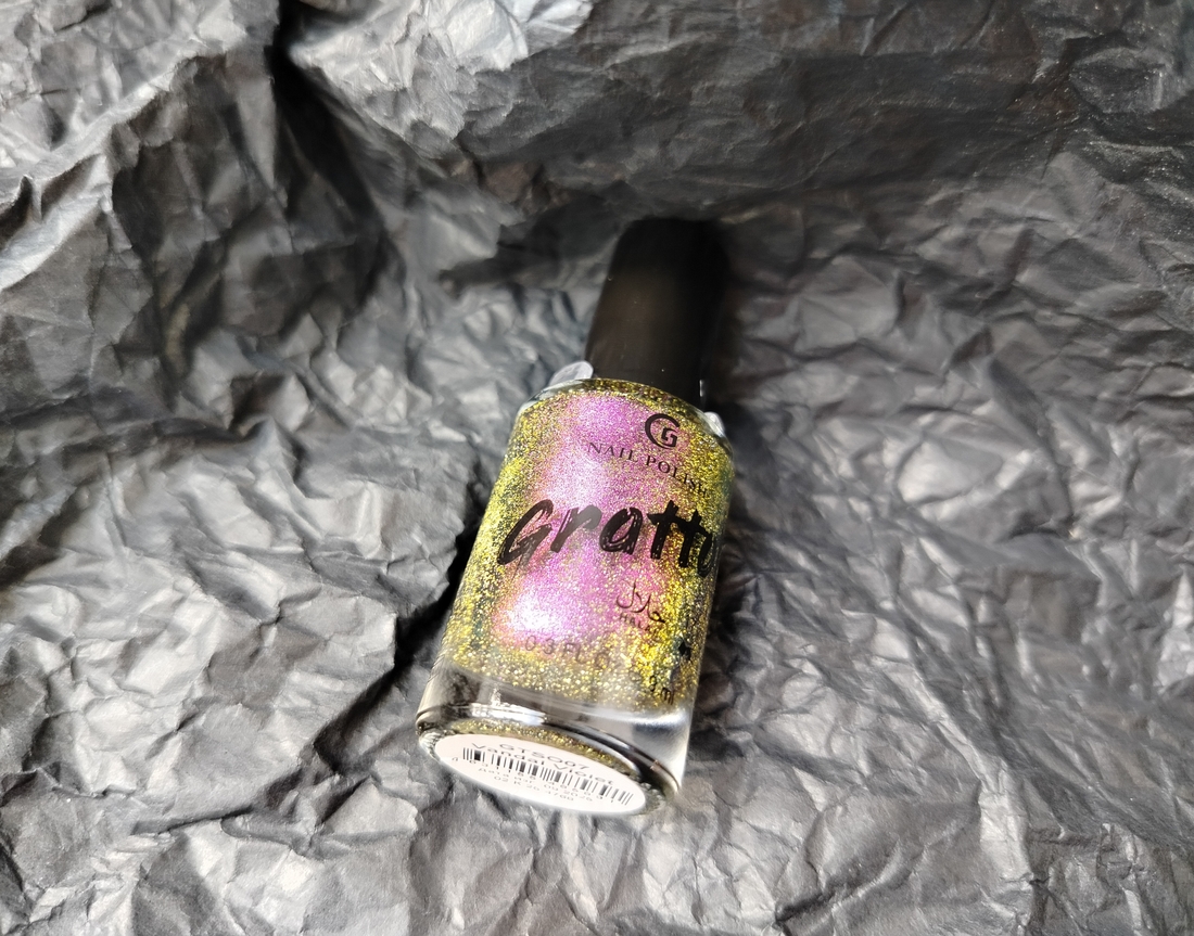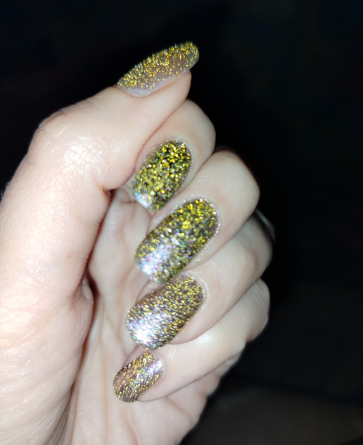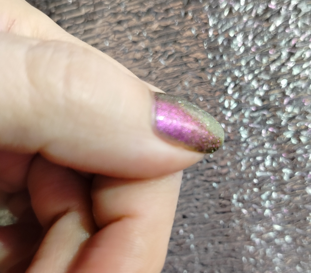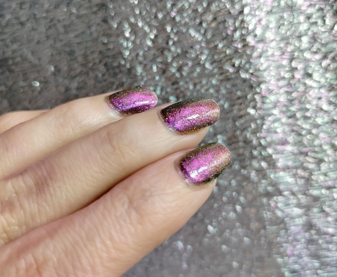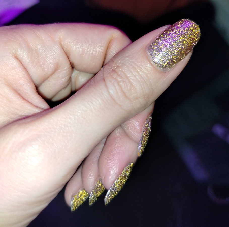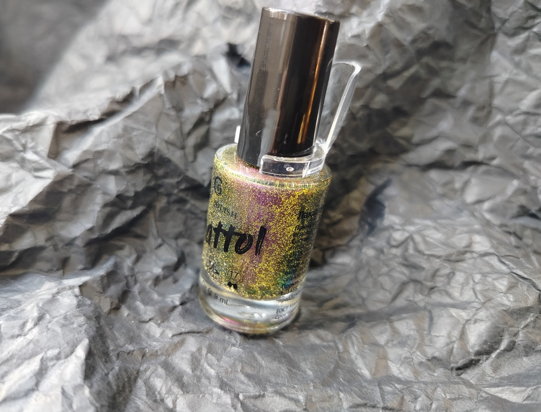 Во флакончике оттенок невероятно красивый и захватывающий — прозрачный с золотым светоотражающим глиттером и мультихромным шиммером (фиолетово-розово-оранжево-золотой с зеленым).