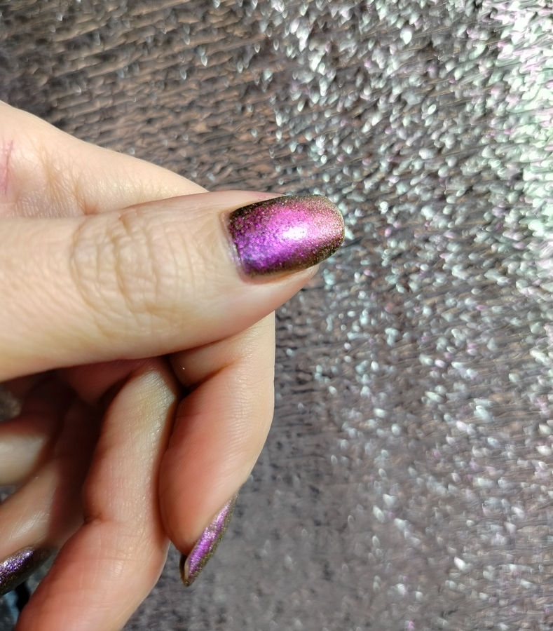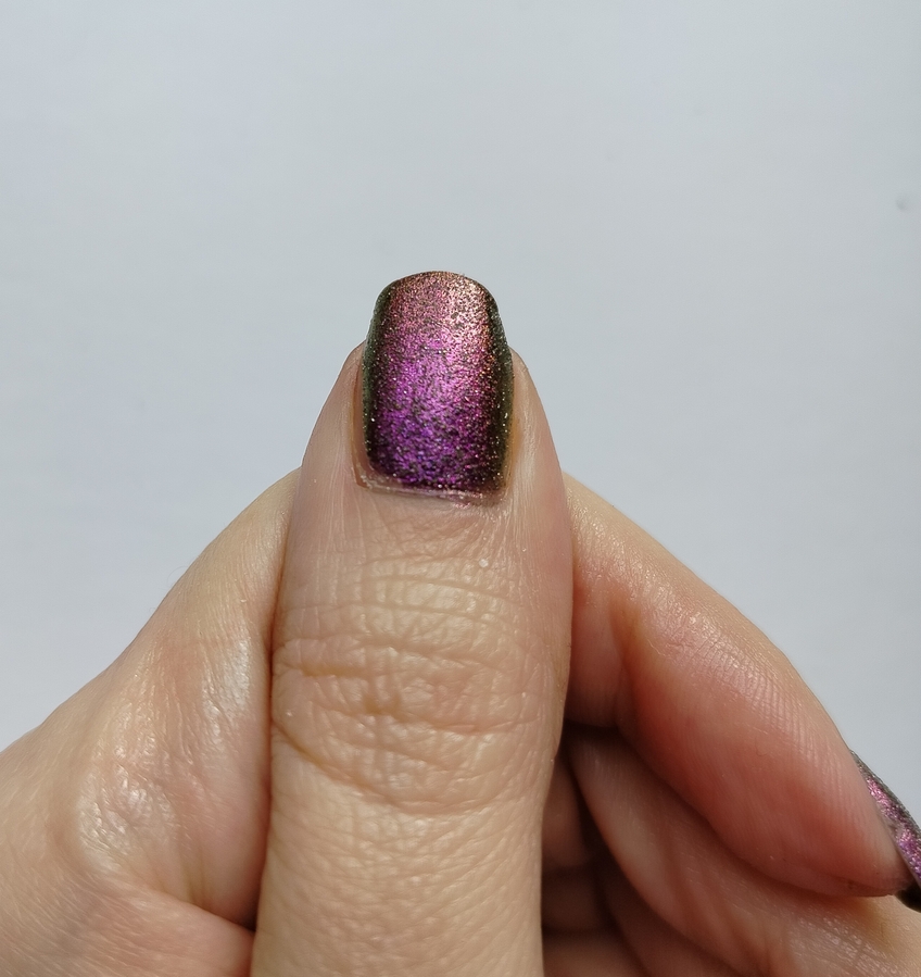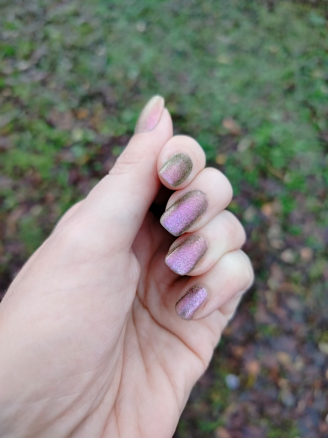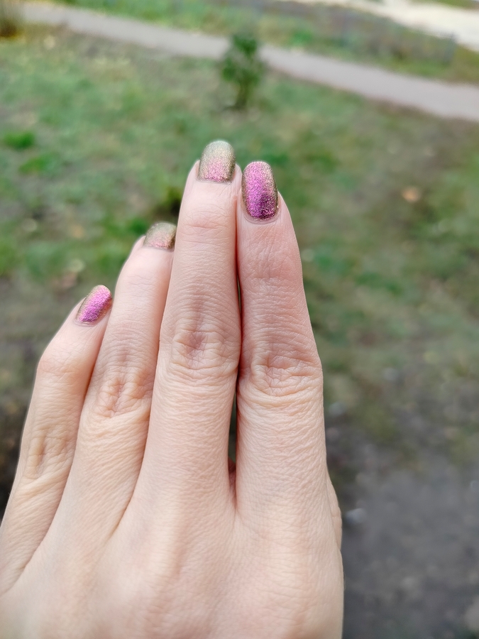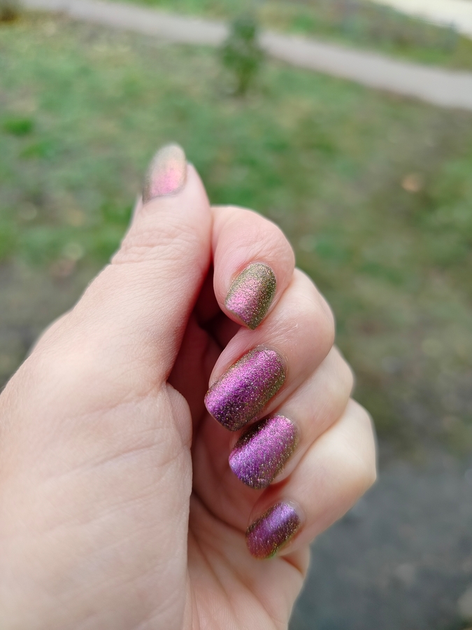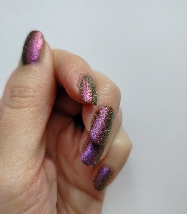 В два слоя — поинтереснее: оттенок насыщеннее, появилось больше желанной мною «зелени», в определенный моменты покрытие выглядело то бронзовым, то уютно состаренным велюром.