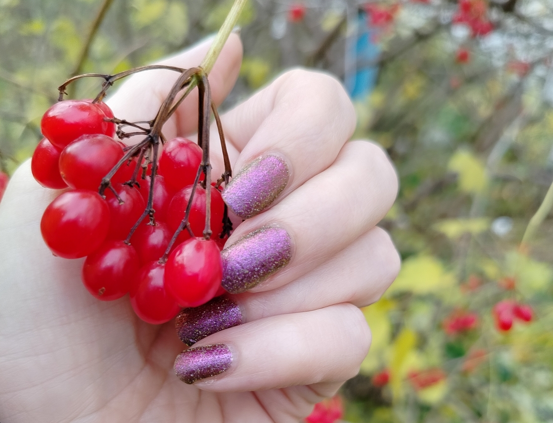 Признаюсь честно, на этом этапе я почувствовала разочарование — лак выглядел достаточно скромно, фиолетовый с блестками, совершенно «без изюма». Только при вспышке можно было заметить красивую россыпь золотых огоньков.