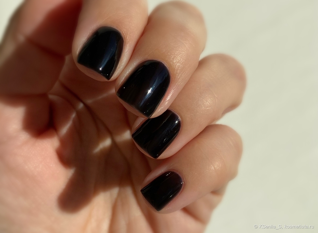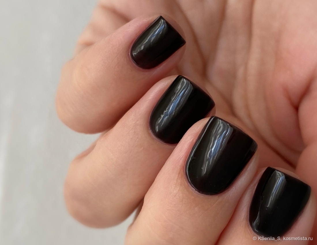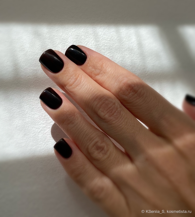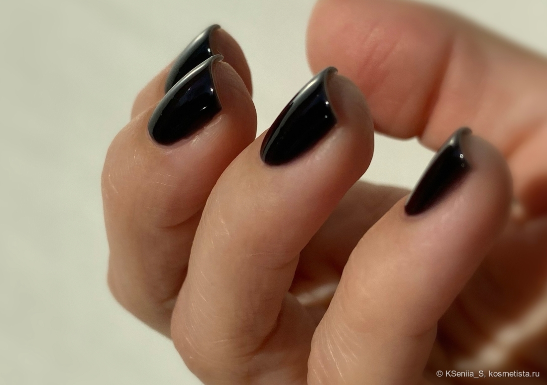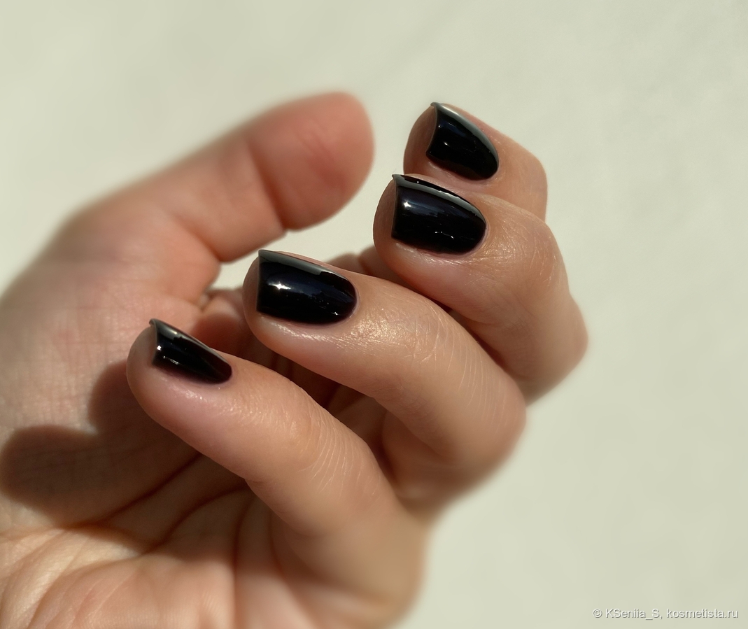 Текстура лака жидкая, цвет черный, прозрачный, потребуется три тонких слоя, чтобы получить однородный цвет. В два слоя ноготь будет чуть просвечивать, мне такой эффект нравится, но не всегда получается нанести равномерно, поэтому три слоя для этого лака то, что доктор прописал.