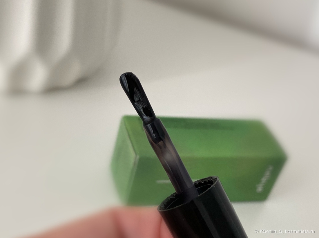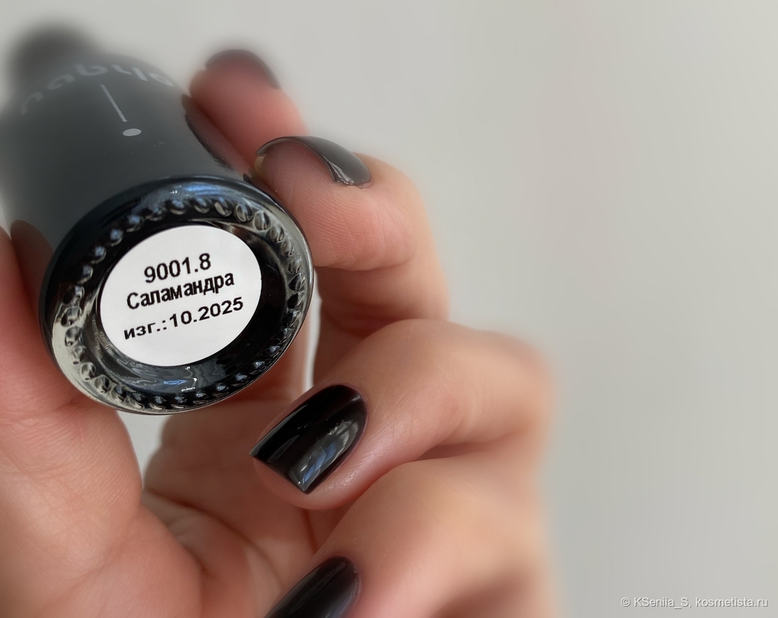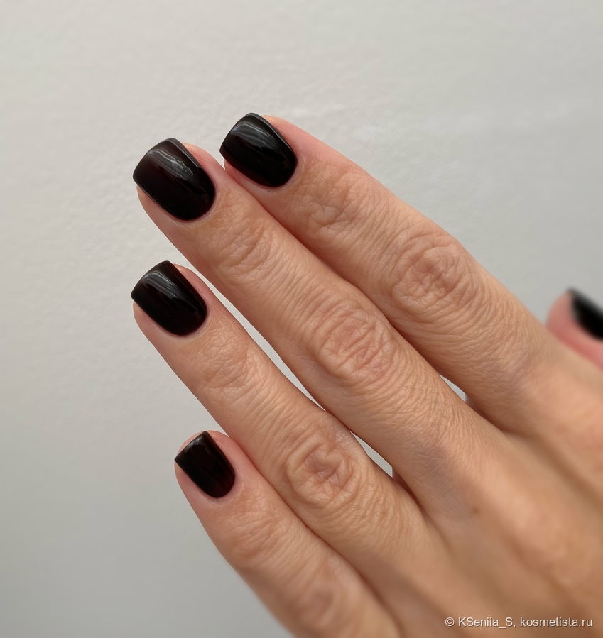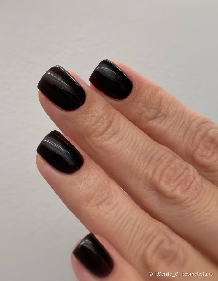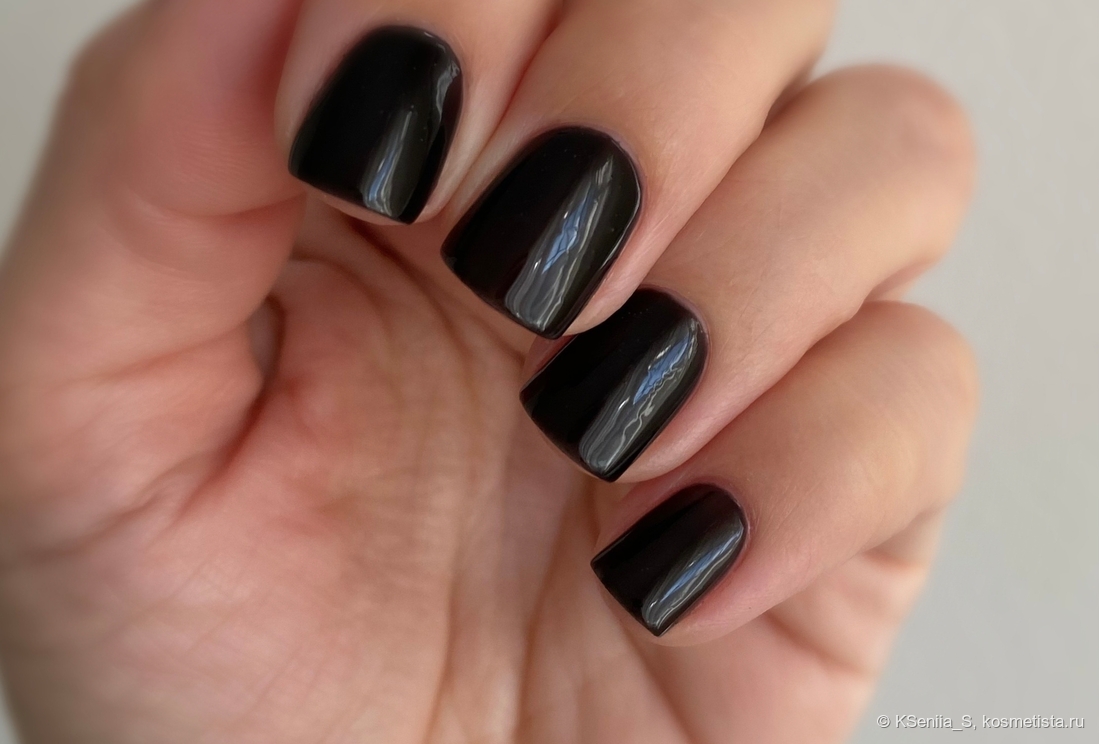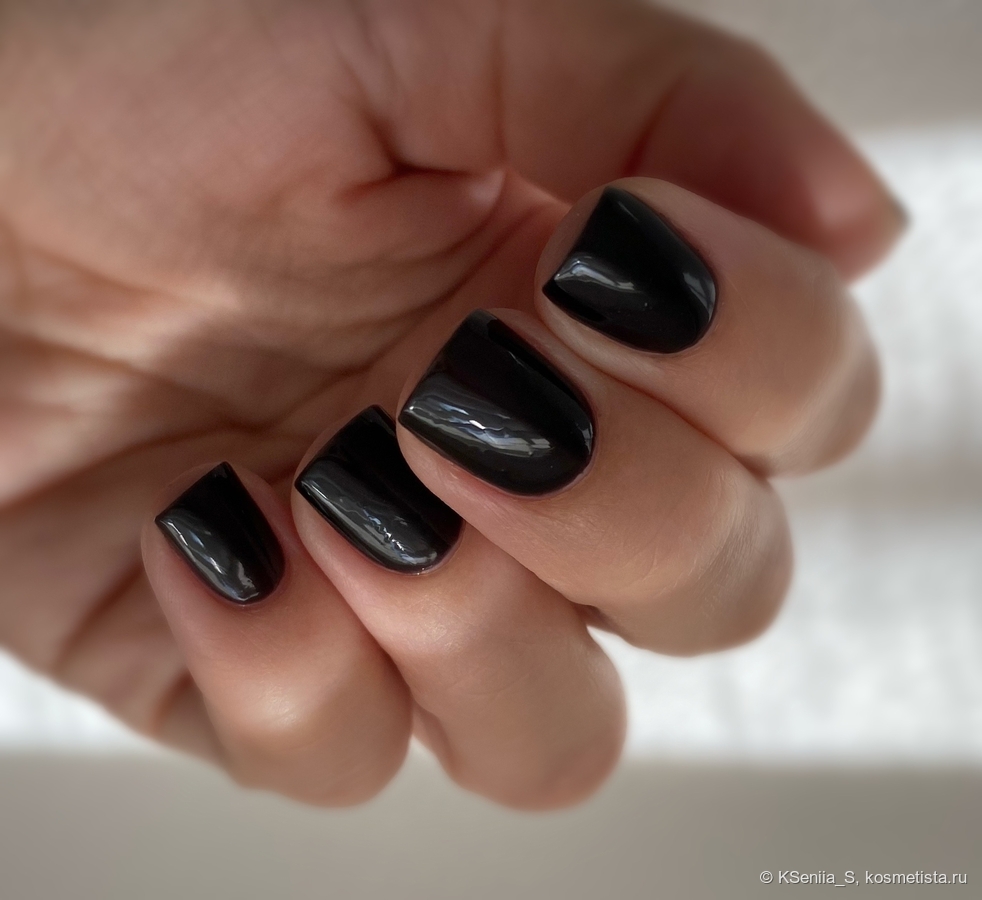 Текстура лака жидкая, цвет черный, прозрачный, потребуется три тонких слоя, чтобы получить однородный цвет. В два слоя ноготь будет чуть просвечивать, мне такой эффект нравится, но не всегда получается нанести равномерно, поэтому три слоя для этого лака то, что доктор прописал.