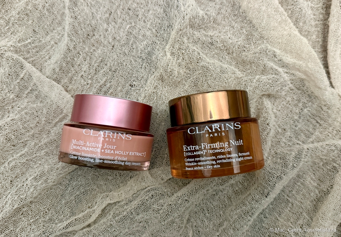 К жирным средствам относятся две банки кремов Clarins Multi-Active Jour — в розовой серии именно дневная версия жирнее, ночная легче. Это для умеренной сухости, скажем так.