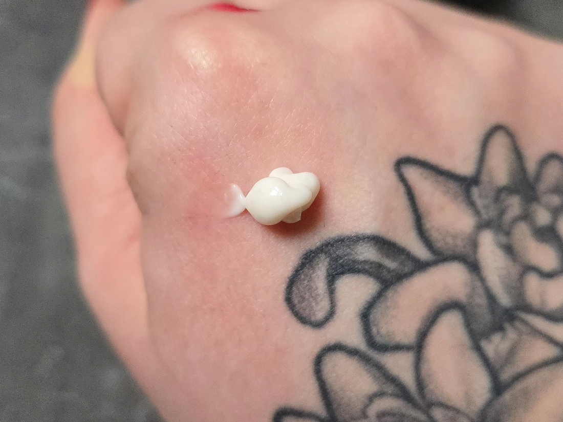Одна доза крема выглядит вот так, размером даже не с горошину, а с целый нут. Причём замоченный. На красное пятно не обращайте внимания, это я проводила инвентаризацию помад для губ, проверяла, кто ещё жив из жидких матовых, а кто уже нет.