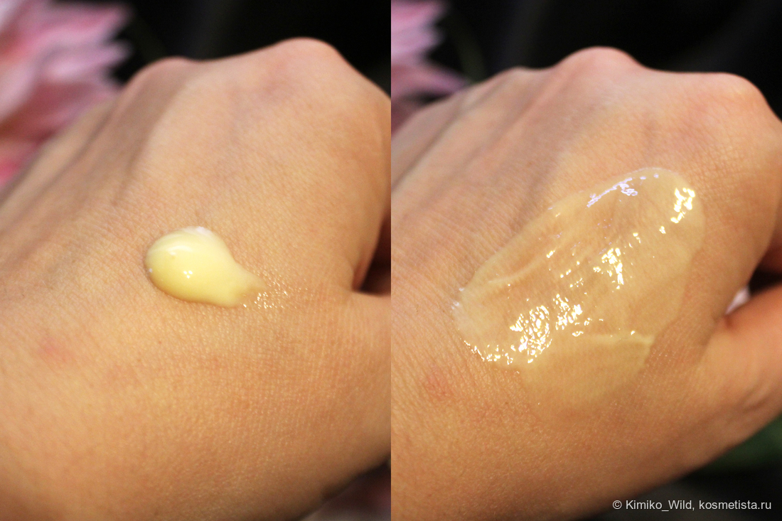 Легко распределяется благодаря текстуре, достаточно быстро впитывается. Наношу на слегка влажную после гидролата кожу, но до нанесения крема жду минут 5-10. Когда пора – определяю на ощупь: поверхность кожи кажется слегка суховатой.