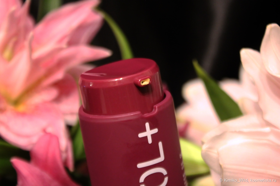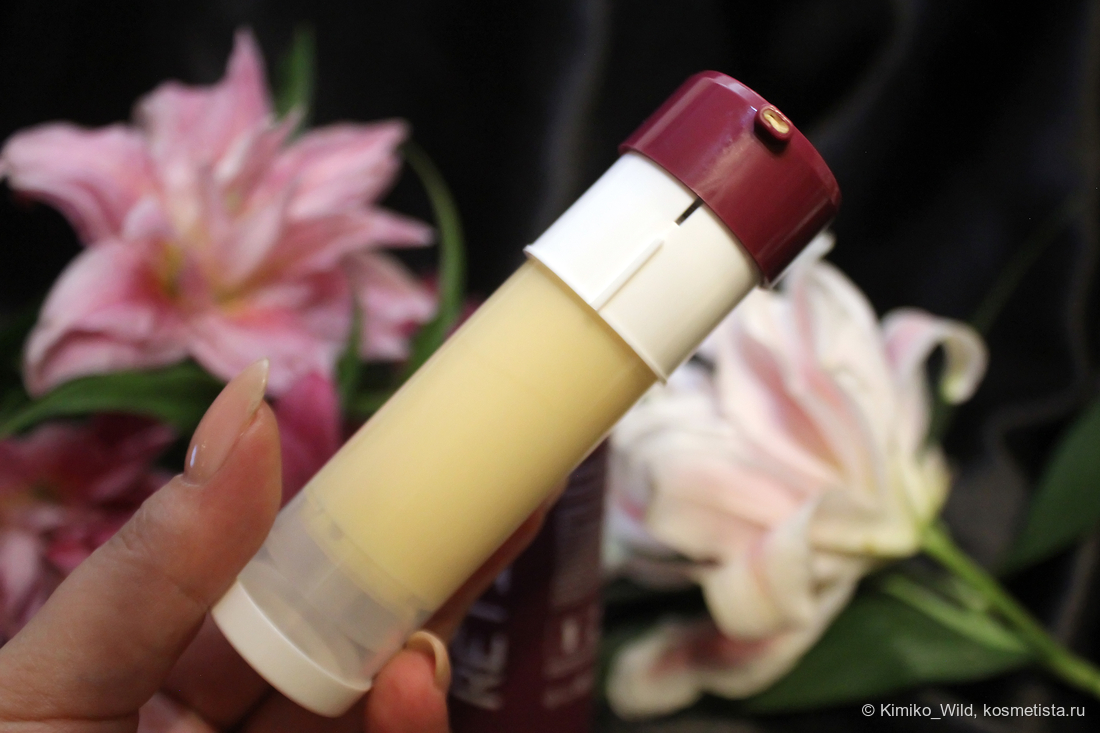 Сама сыворотка похожа на лёгкий жидковатый крем с жёлтым оттенком, со слабым запахом (мне почему-то напоминает парфюмерную влажную древесину). Дозатор выдаёт скромную порцию, я использую количество от 3-4 нажатий.
