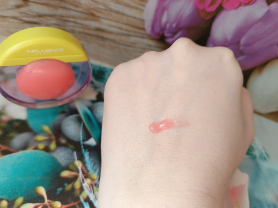 Оттенок теплый, коралловый. Разумеется он не очень плотный и будет полупрозрачным, но все же не совсем прозрачным. Бальзам имеет свой цвет, и мне это нравится. По текстуре он густой, слегка липкий. По крайней мере с распущенными волосами я бы его не носила.