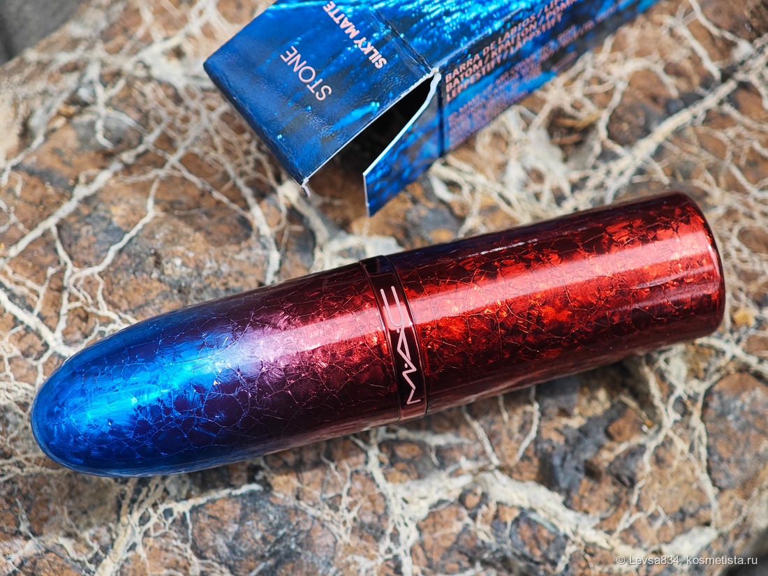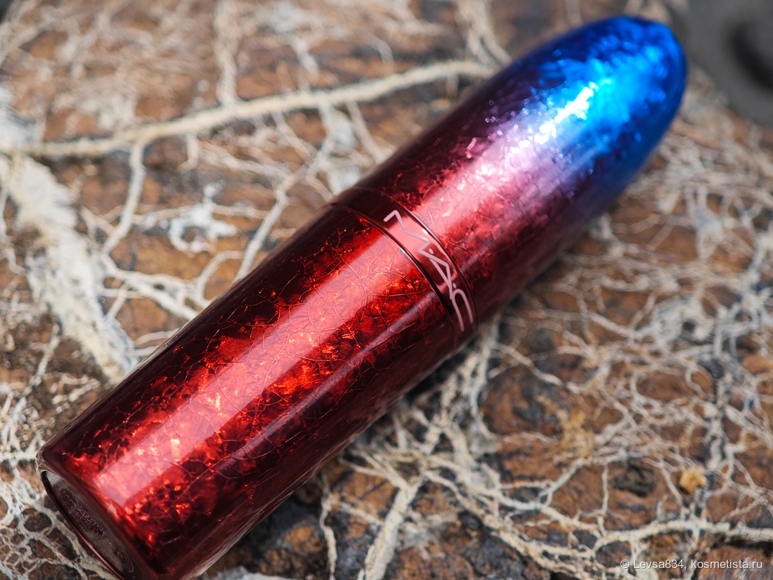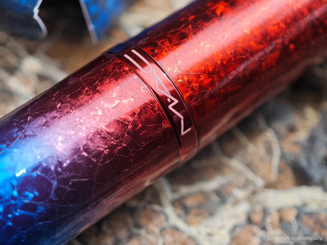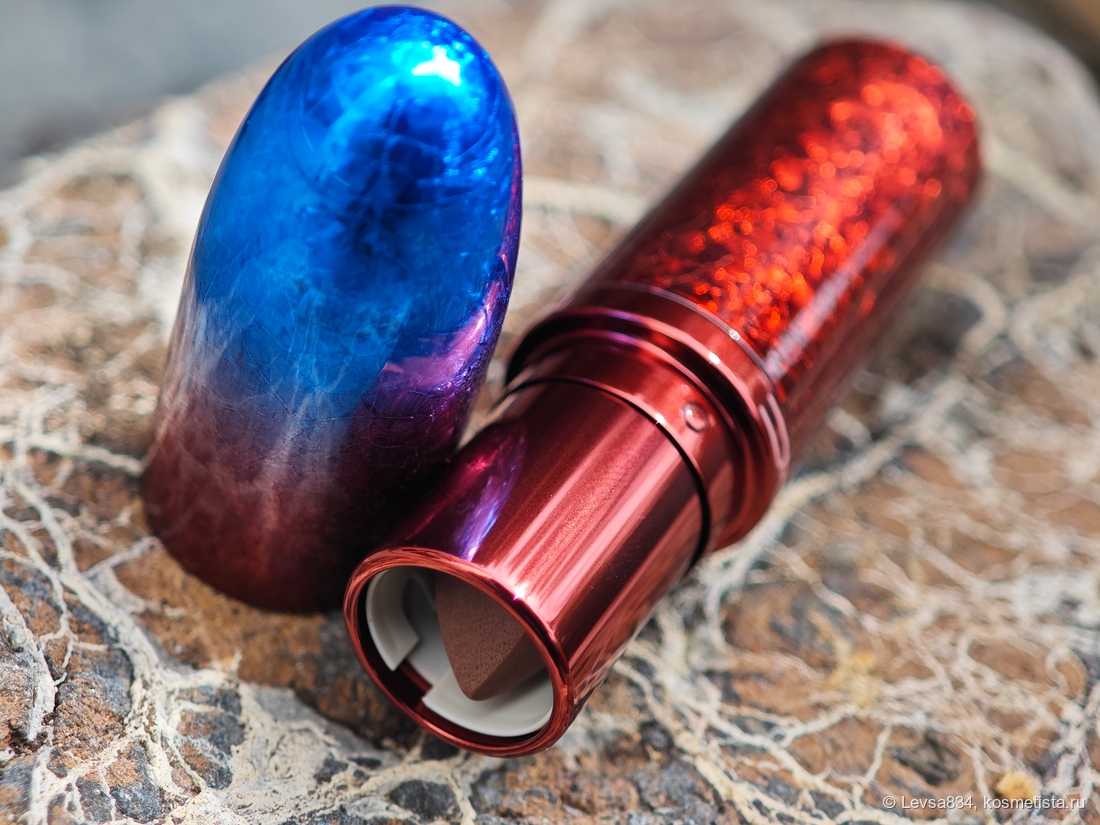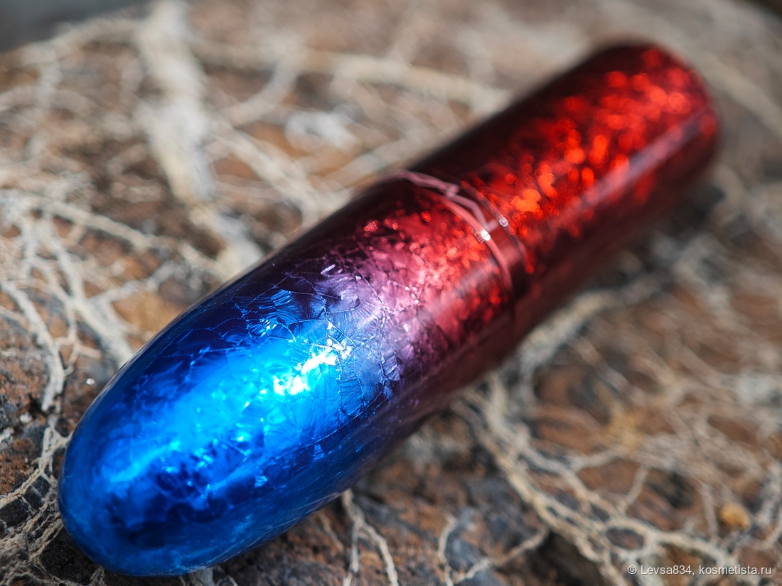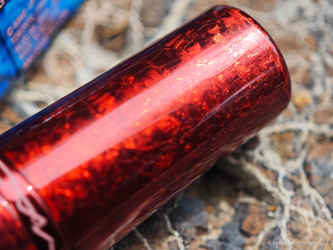 Если вы ещё здесь, значит, поняли и прониклись, до чего же красив футляр этой лимитированной серии. Синий конус колпачка и ярко-красный корпус помады, размер современный, увеличенный, поясок тоже есть, он красного цвета и матовый. Сама поверхность пластикового футляра похожа на фольгу, залитую лаком, рисунок словно объёмный, чешуйчатый, волшебный. Смотришь игру переливов цвета и оторваться невозможно. В последнее время бренд превзошёл себя, создав редкую красоту для лимитированных коллекций.