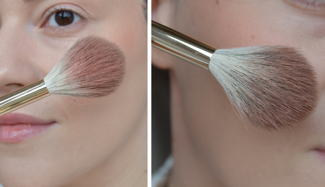 Чем же я их наношу? Давайте покажу свою кисть. Она натуралка, только я не помню, какой ворс; очень удобная кисточка, ворс мягкий, набирает относительно немного продукта, да и стряхнуть его никто не мешает. Позволяет нанести румяна вуально и позволяет их наслоить до состояния Марфушеньки. Другие кисти с ними не работают лично у меня.