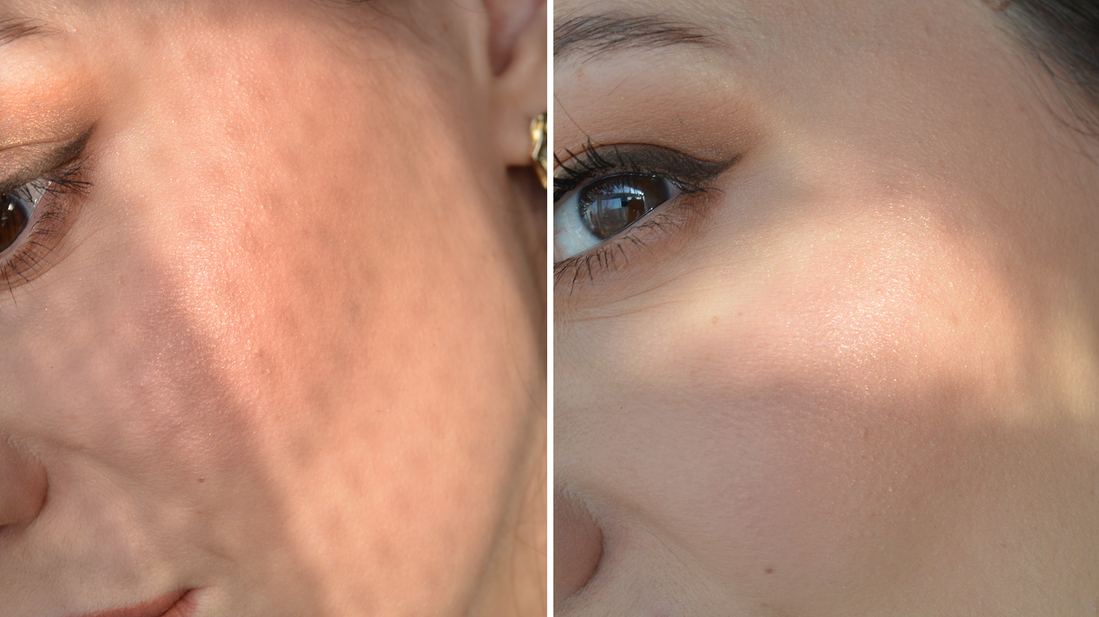 Как видите, припудривание помогает, но совсем чуть-чуть. Румяна все еще подчеркивают текстуру.