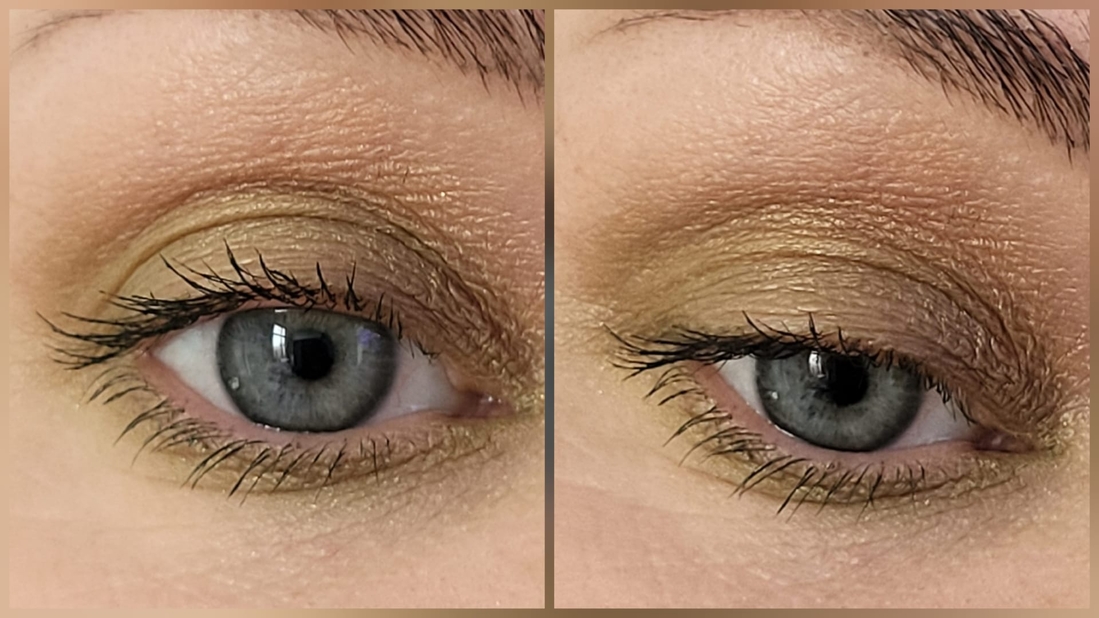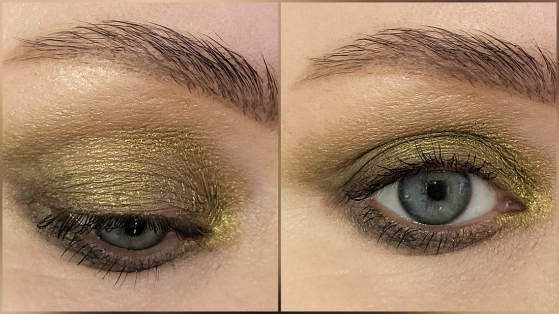 В третьем варианте нанесла тот самый матовый (2) полностью на верхнее и нижнее веко (проще говоря, намазала его вокруг глаза) и оттушевала золотым, нанеся его ещё и поверх (1) — первый оттенок в палетке: